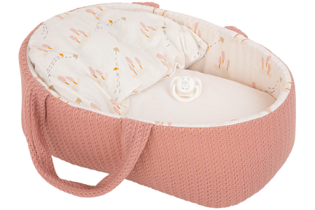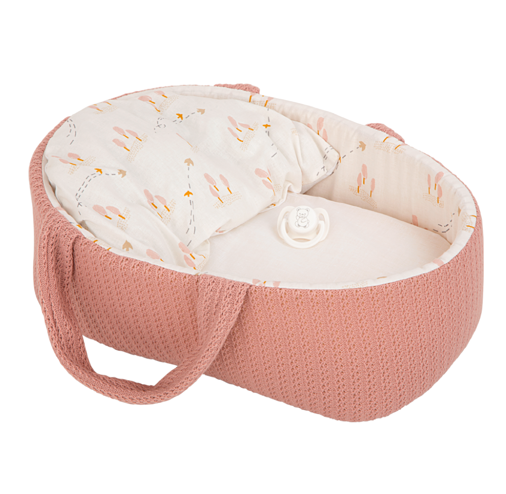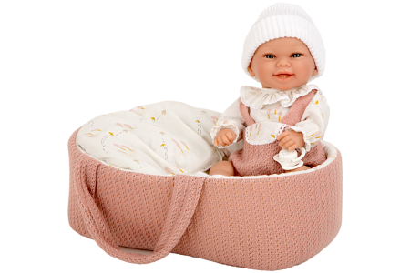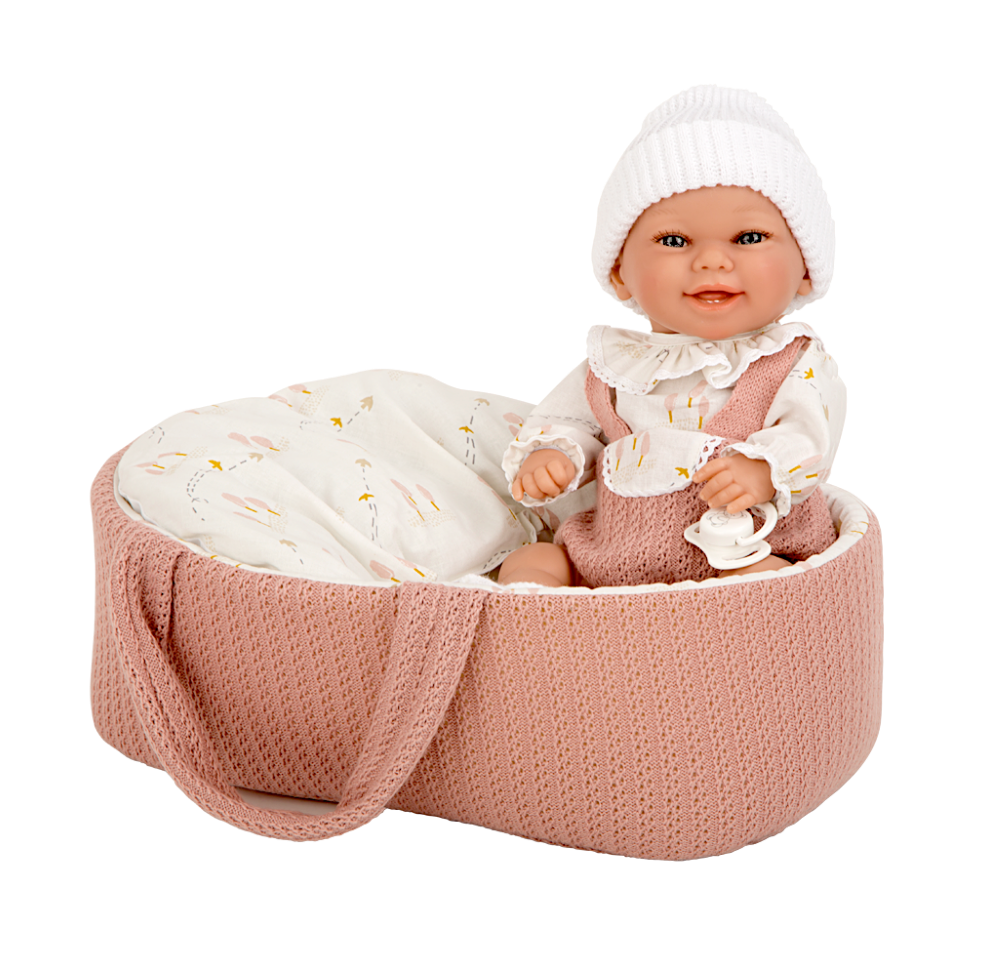 • Lėlytė aprengta rausvais ir baltais rūbeliais ir paguldyta į derančią nešyklę.