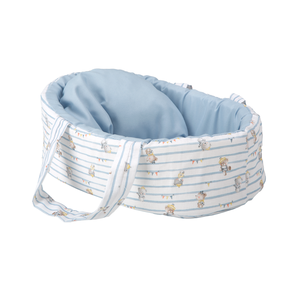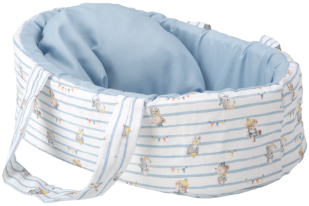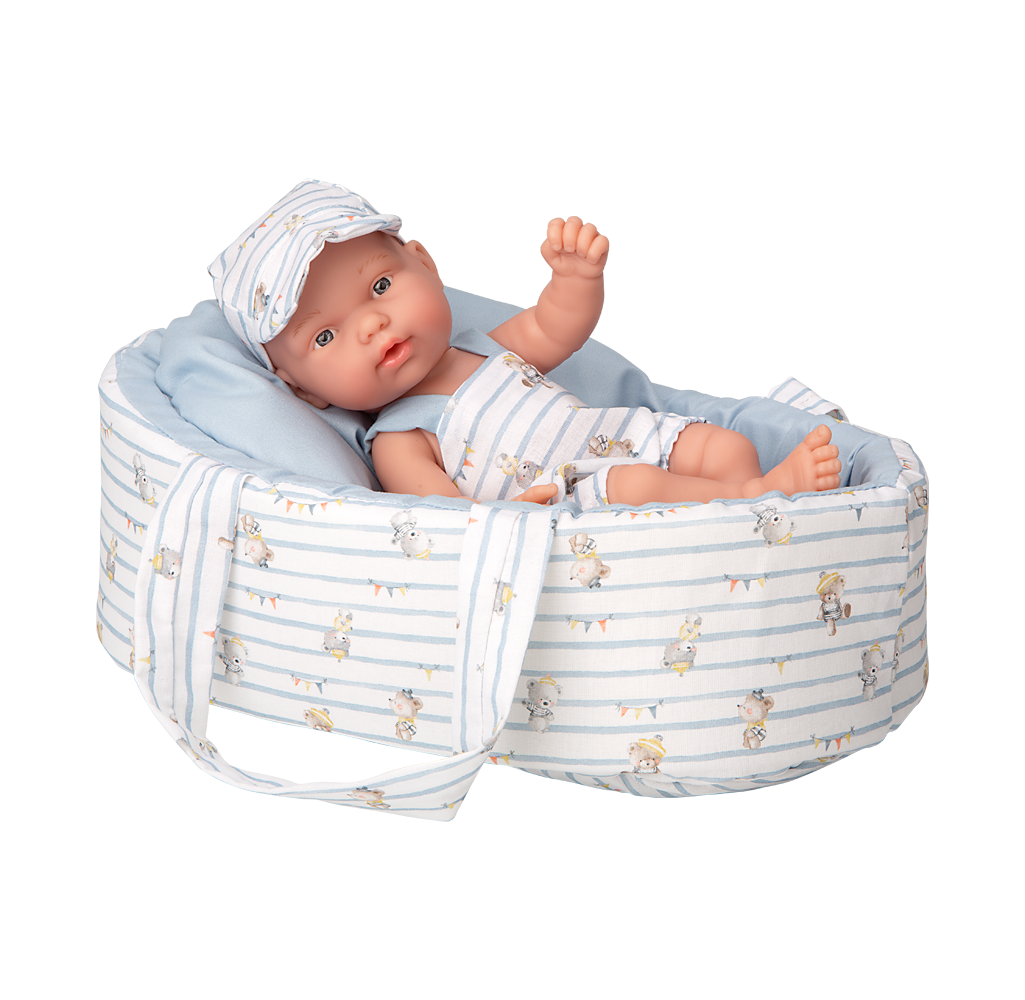Arias kūdikėlis žydroje nešyklėje su meškiukais, 26 cm