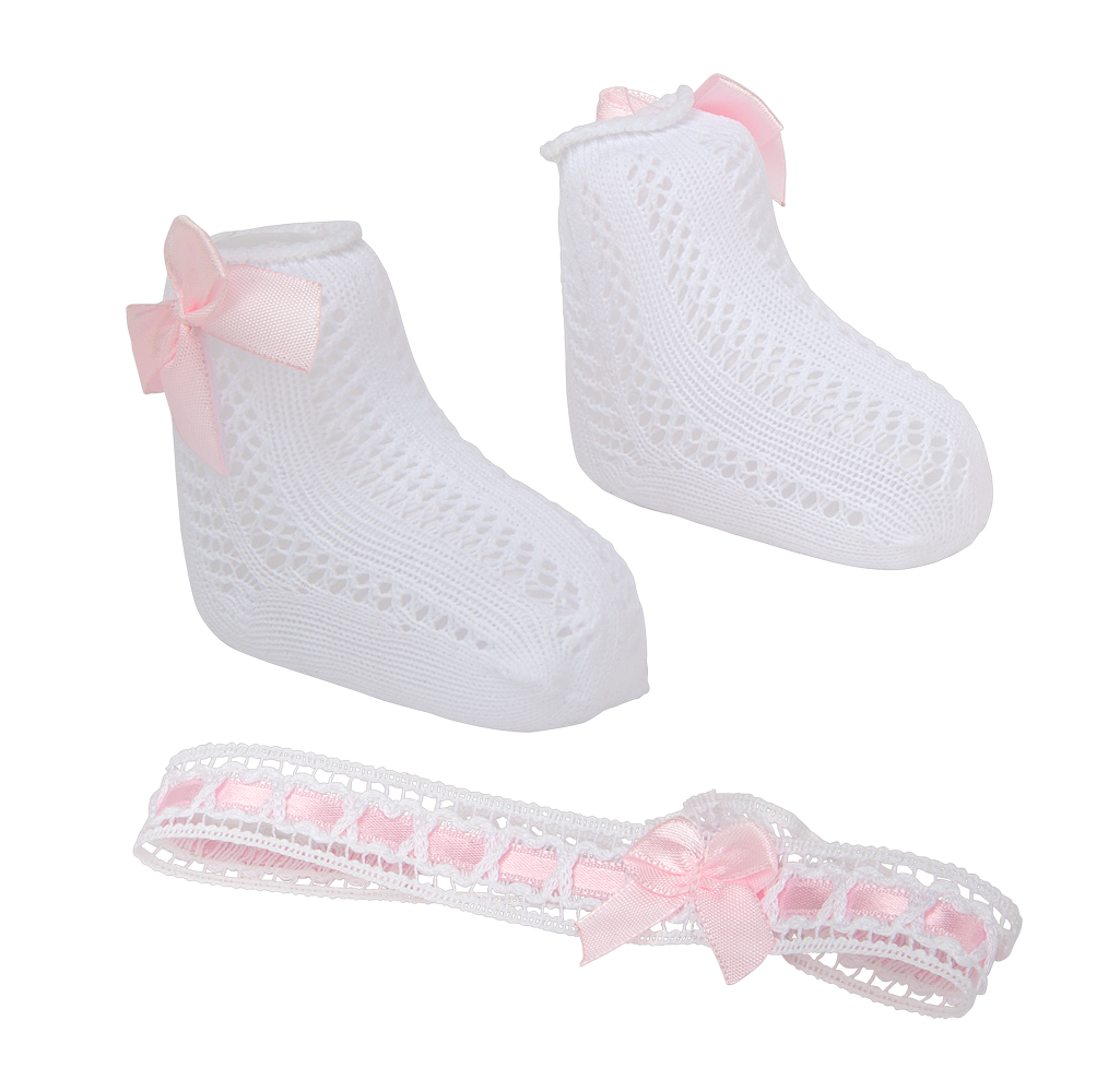 Kojinytės ir lankelis dekoruoti rožiniais kaspinėliais.
