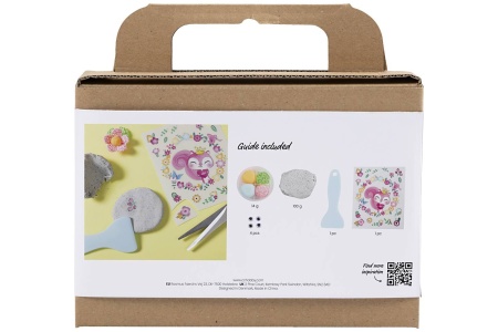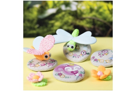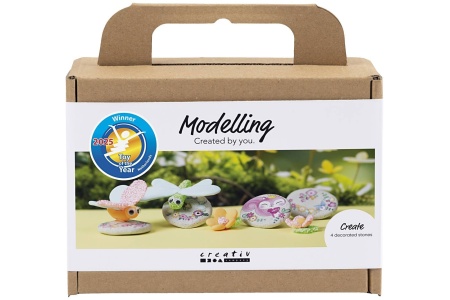 Šis rinkinys leidžia vaikams patiems susikurti unikalius akmenukus, kuriuos jie gali papuošti lipdukais bei iš modelino pagamintais padarėliais ir kitais kūriniais.