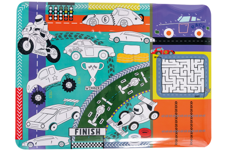 4 skirtingos užduotys ant vieno daugkartinio kilimėlio. Galima spalvinti linksmus paveikslėlius, sujungti taškelius pagal skaičius, ieškoti išėjimo labirinto užduotėlėje ar žaisti kryžiukus nuliukus!