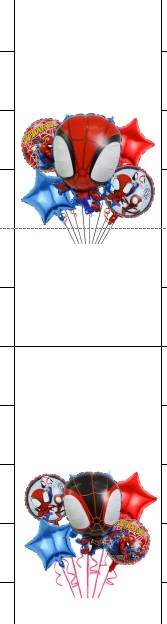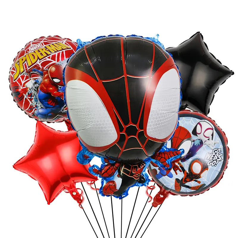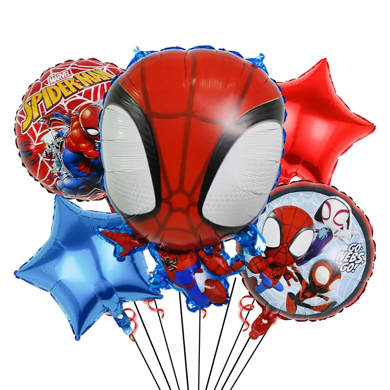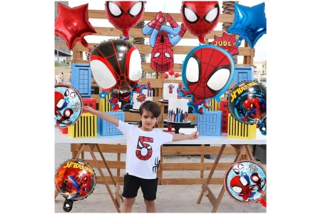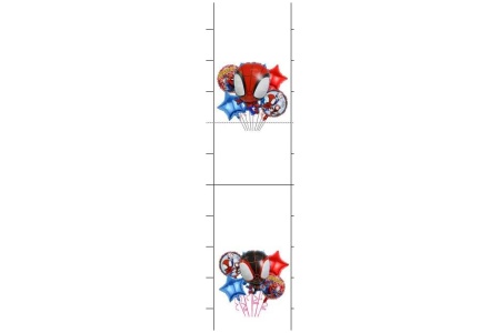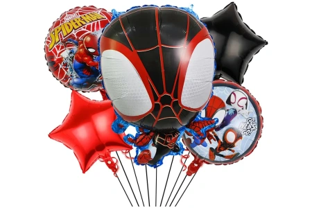 Balionų rinkinys Žmogus voras, į rinkinį įeina 5 vnt balionų, 2 vnt folinių raudonų/mėlynų žvaigždučių, 2 vnt apvalių folinių balionu su žmogaus voro ,bei jo draugų atvaizdu,