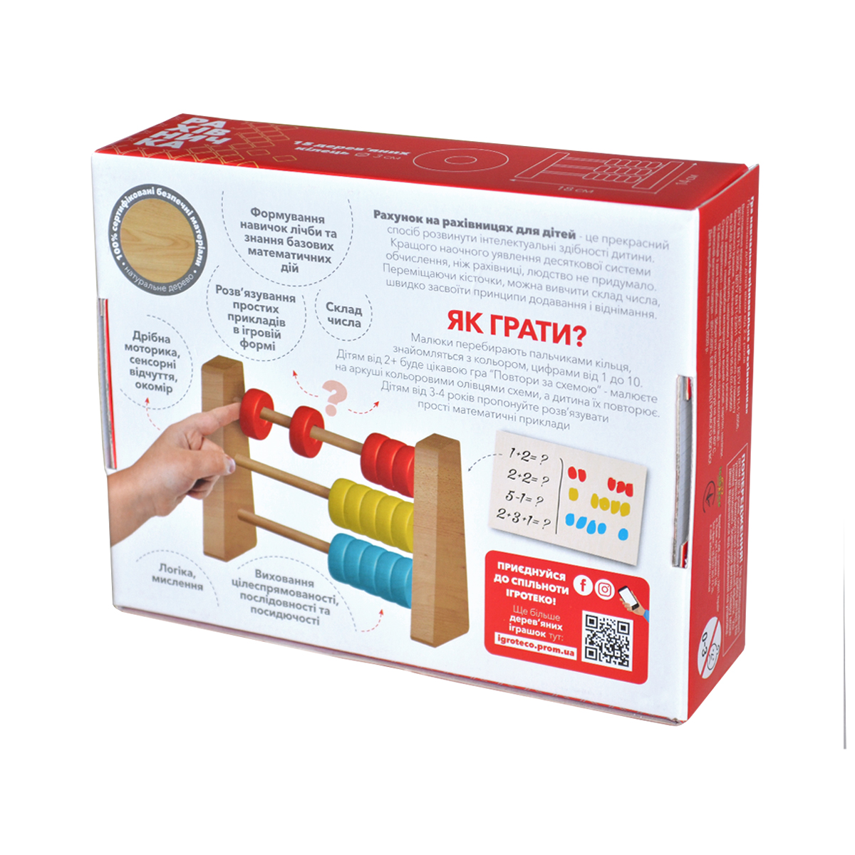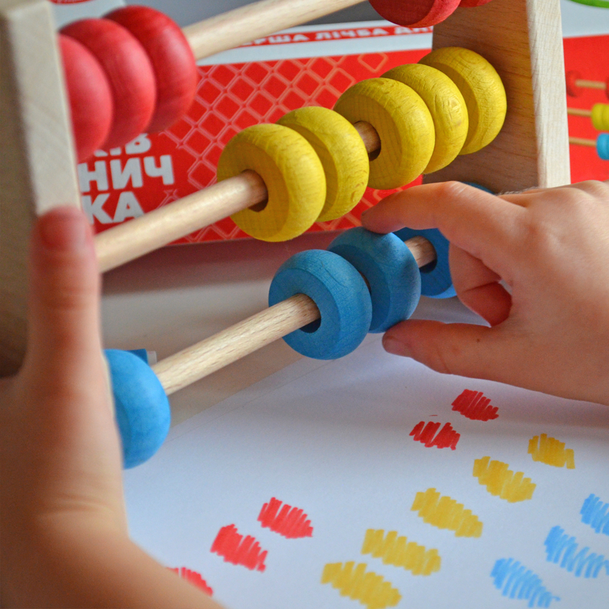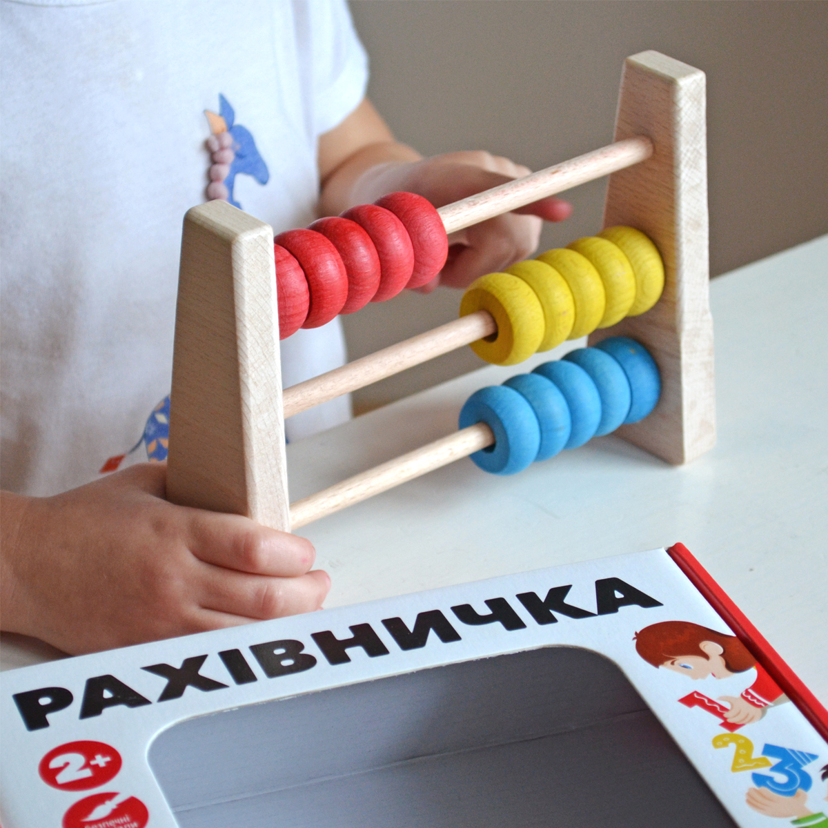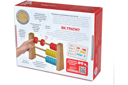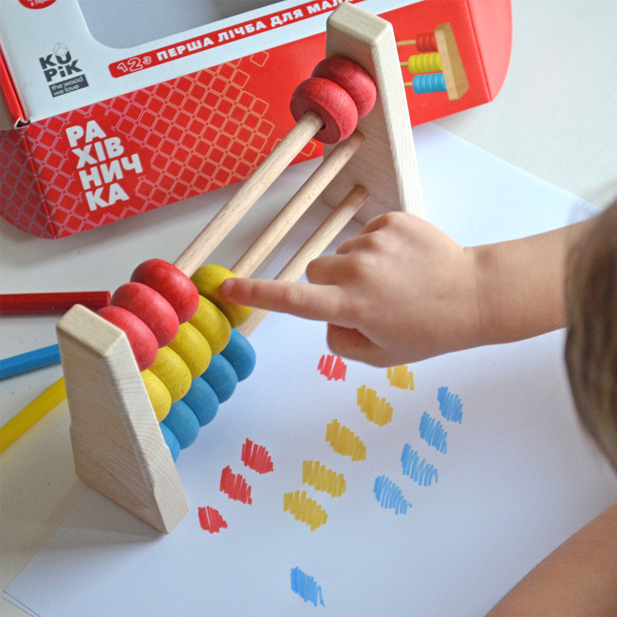 Stumdydami pupeles išmoksite skaičiuoti bei pradėsite mokytis atlikti sudėties ir atimties veiksmus. Žaidimas su abaku atitinka pagrindinius Montessori metodo principus. Lavina loginį mąstymą, smulkiąją motoriką, rankų ir akių koordinaciją.