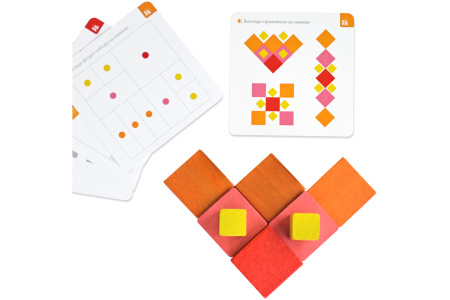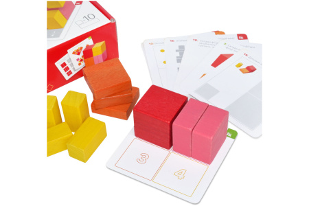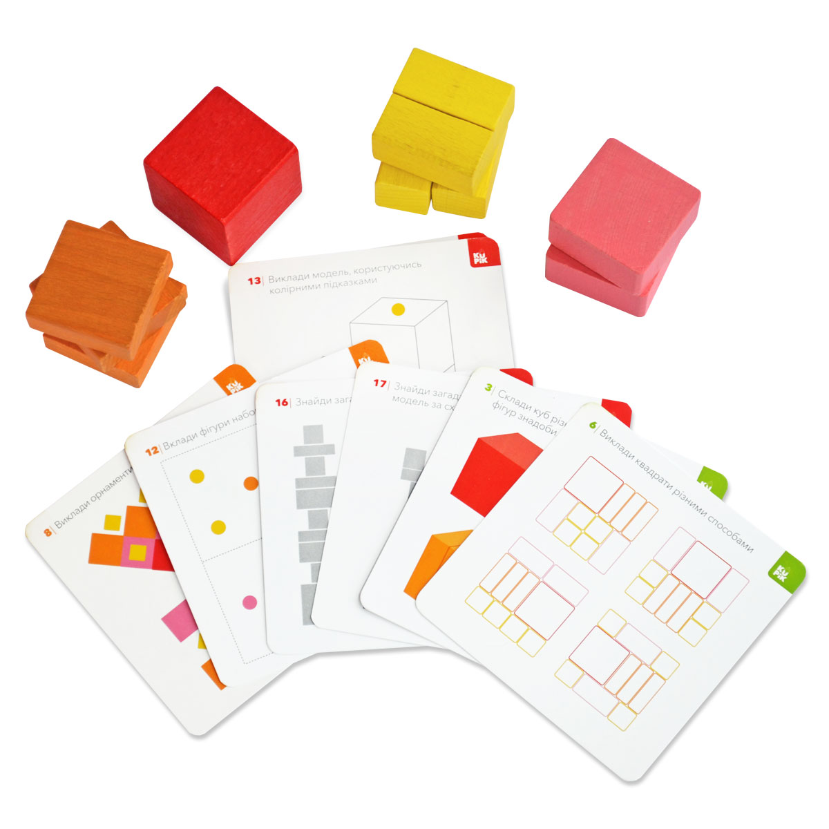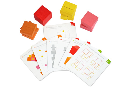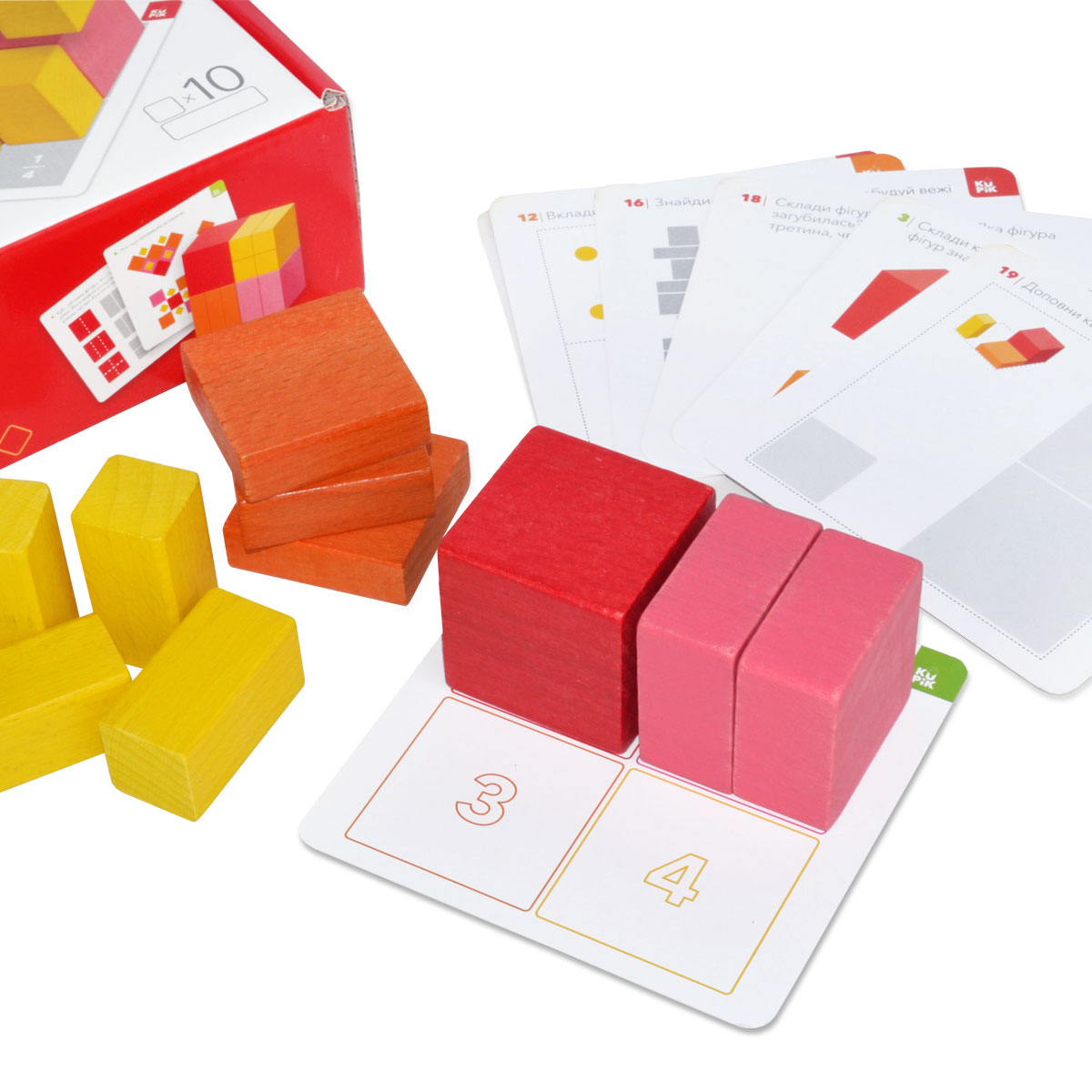 • 10 spalvotų loginių kaladėlių: 1 raudonas kubas (4x4x4cm) 2 rožinės kaladėlės (pusė), kurios yra lygios raudonai kaladėlei 3 oranžinės kaladėlės (trečdalis), kurios yra lygios 1 raudonai kaladėlei. Taip pat lygios 2-iem rožinėms kaladėlėms 4 geltonos kaladėlės (ketvirtadalis), kurios lygios 1 raudonai kaladėlei. Taip pat lygios 2-iem rožinėms kaladėlėms. Ir, be abejo, bus lygios trims oranžinėms kaladėlėms.
