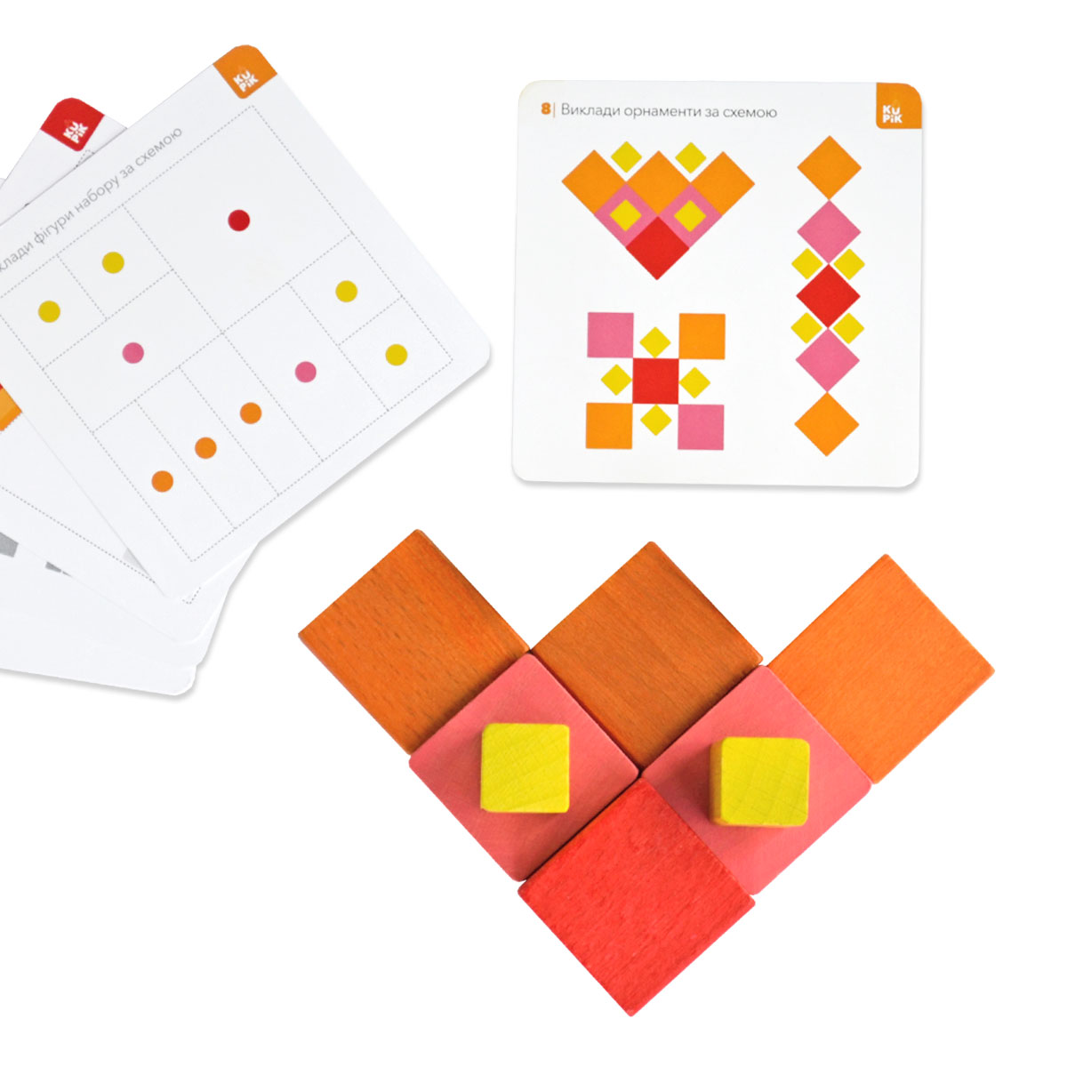 • 10 dvipusių kortelių su loginėmis užduotimis, galvosūkiais, 3D modeliais bei raštais. Puikus būdas paaiškinti paprastus matematinius dėsnius, įskaitant ir trupmenas. Juk daugelis daiktų (pica, obuolys, saldainiai) gali būti ne tik sveiki, bet ir padalinti į lygias dalis: dvi (pusė), tris (trečdalis), keturias (ketvirtadalis).
