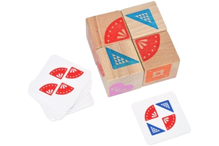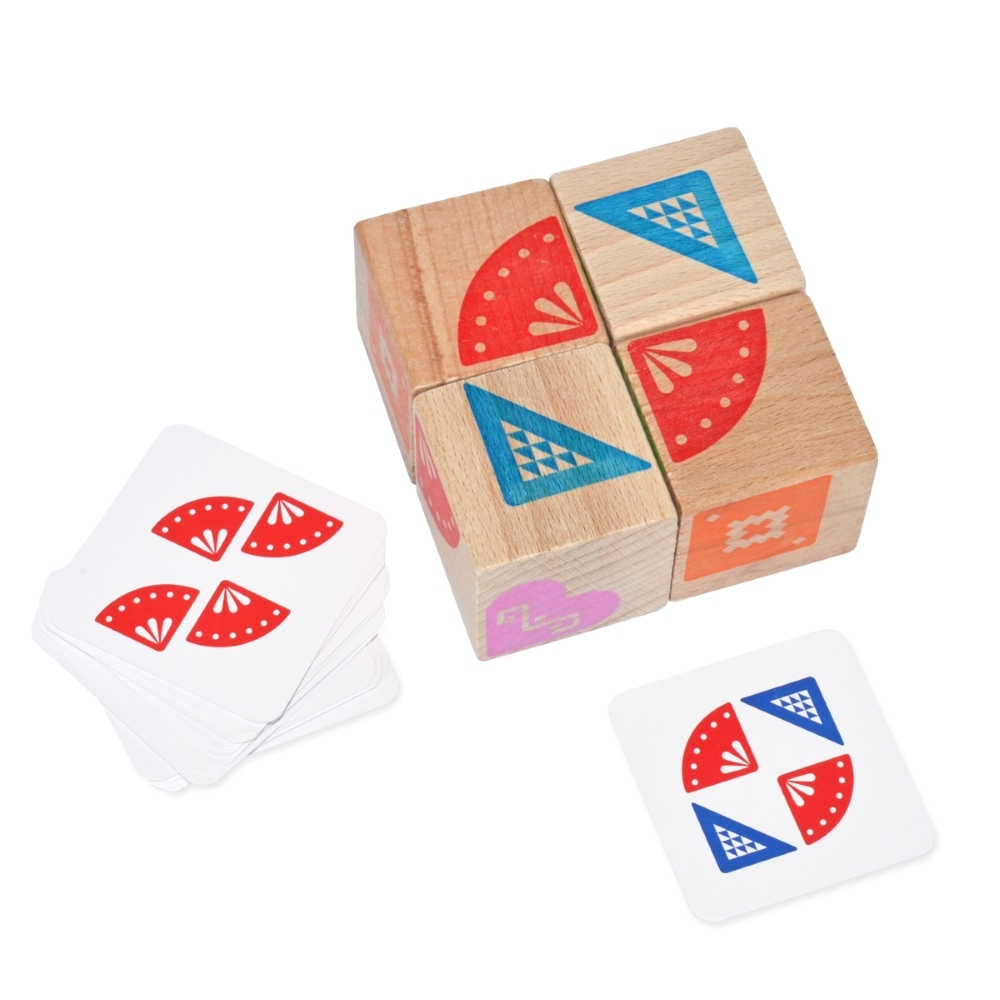 - 4 medinės kaladėlės su raštais (kaladėlės dydis 4 x 4 x 4 cm).