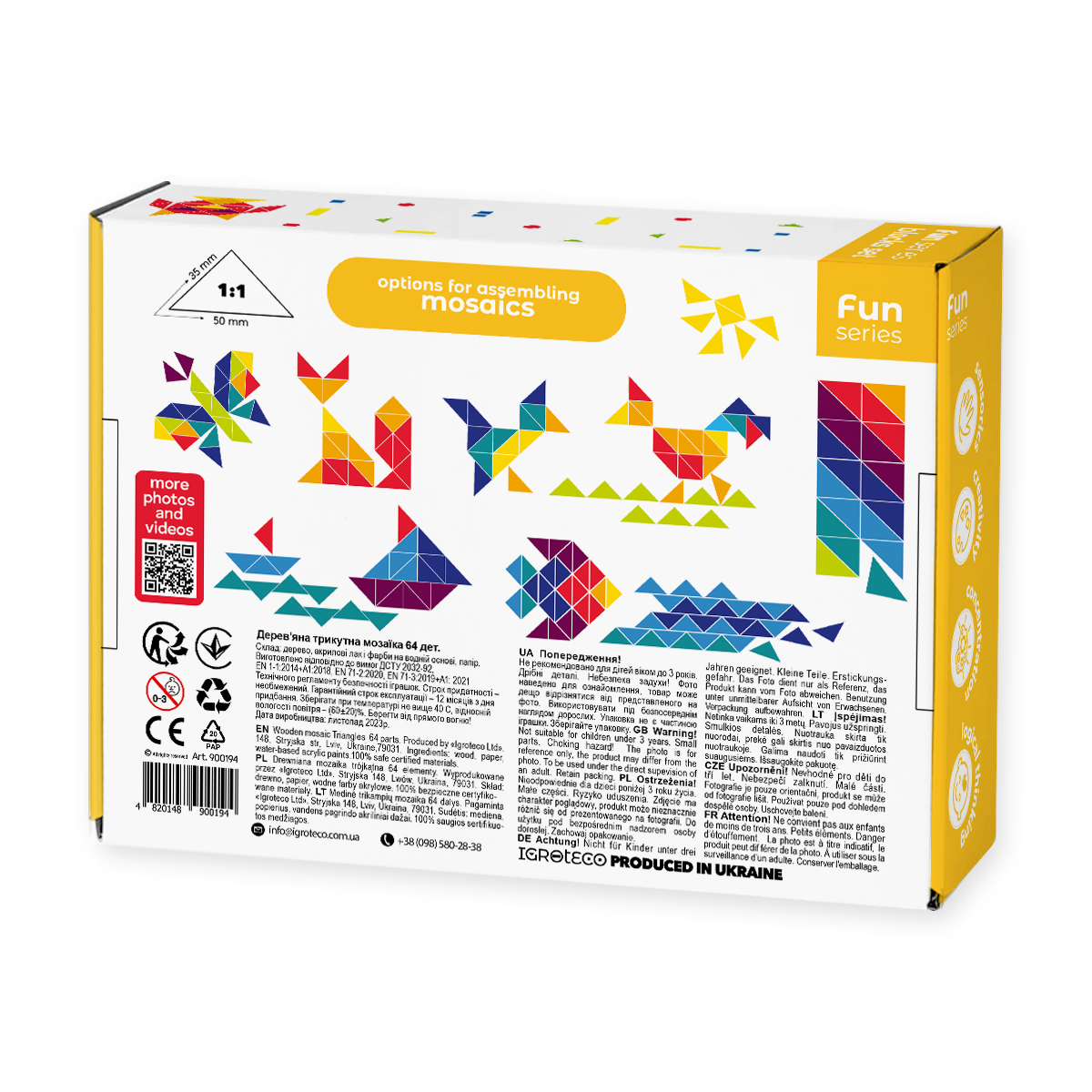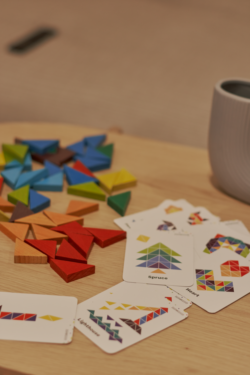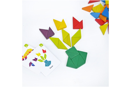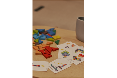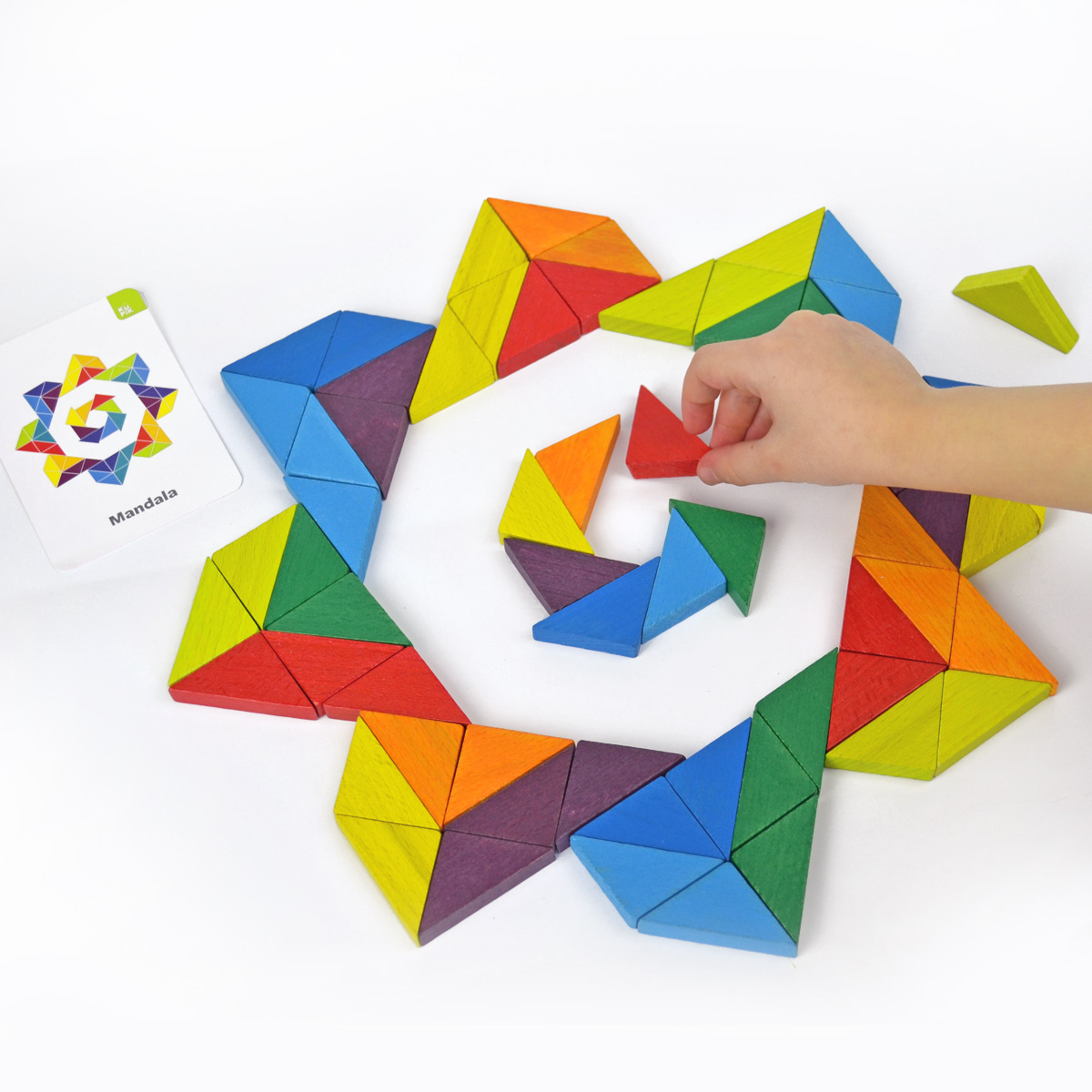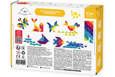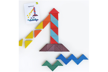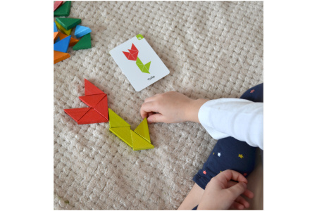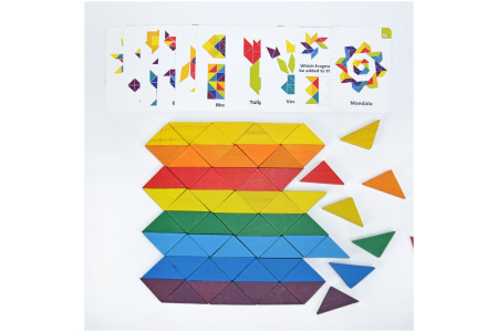 Šiame rinkinyje rasite 64 įvairių spalvų trikampius bei 10 dvipusių spalvotų kortelių su įdomiomis užduotimis, mozaikomis ir vaizdais.