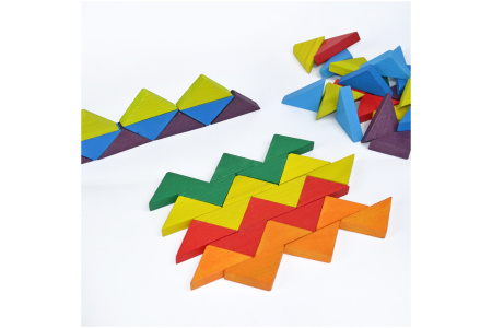 Iš trikampių galima sudėti gyvūnus, augalus, namų apyvokos daiktus, skaičius, raides, geometrines figūras bei raštus.