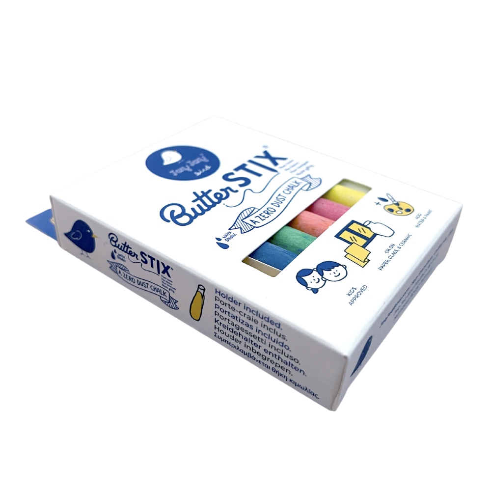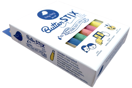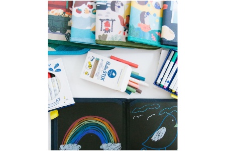 Rinkinyje yra 12 skirtingų spalvų ir vienas specialus kreidelės laikiklis.
