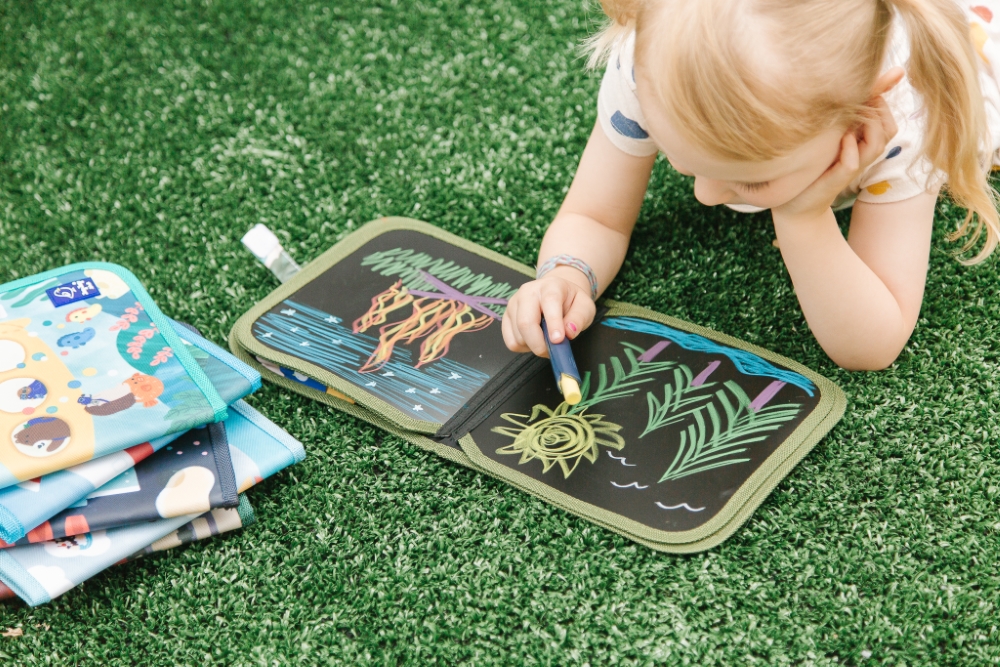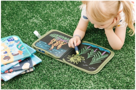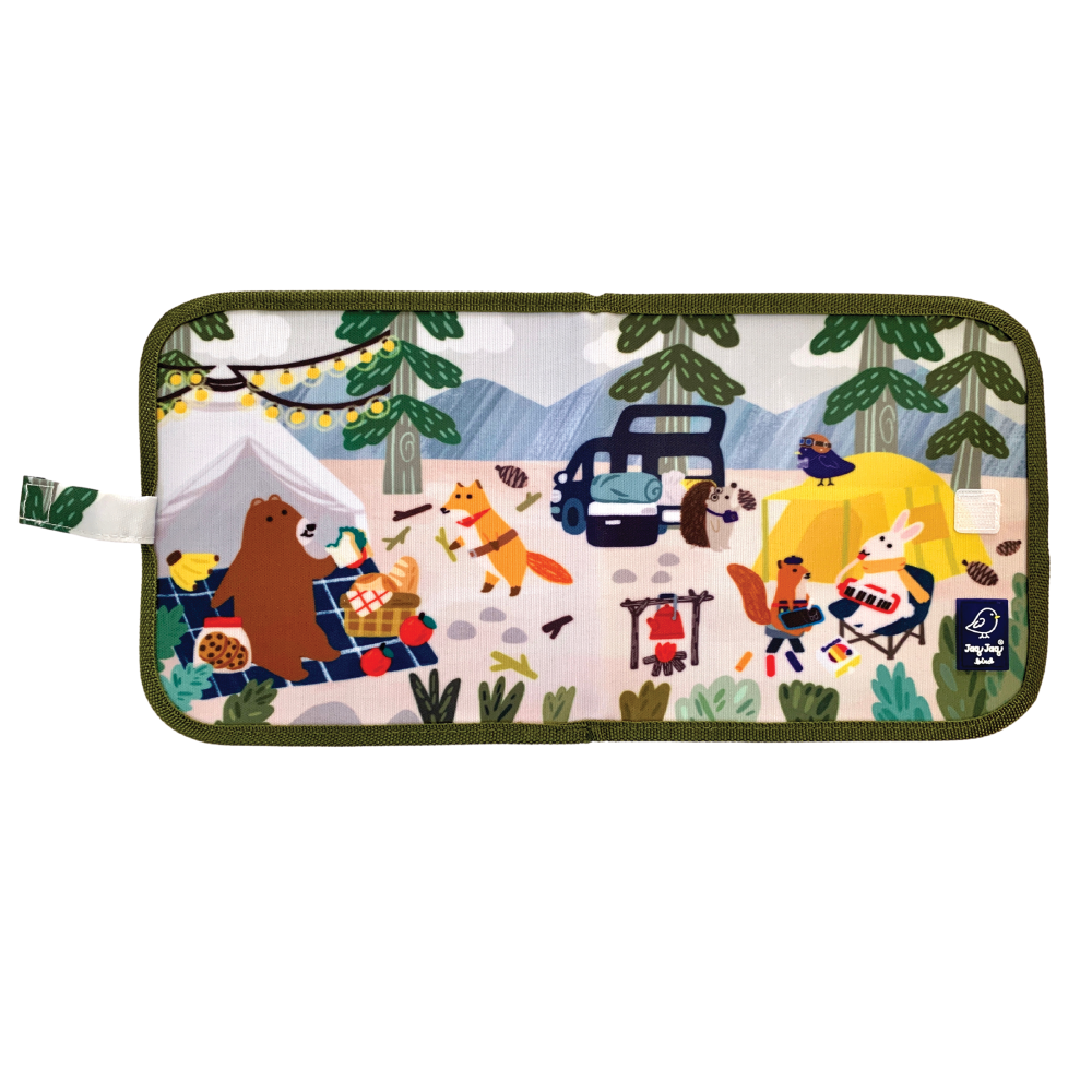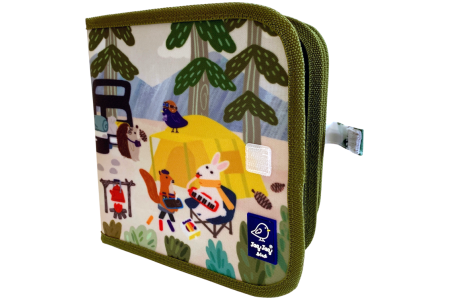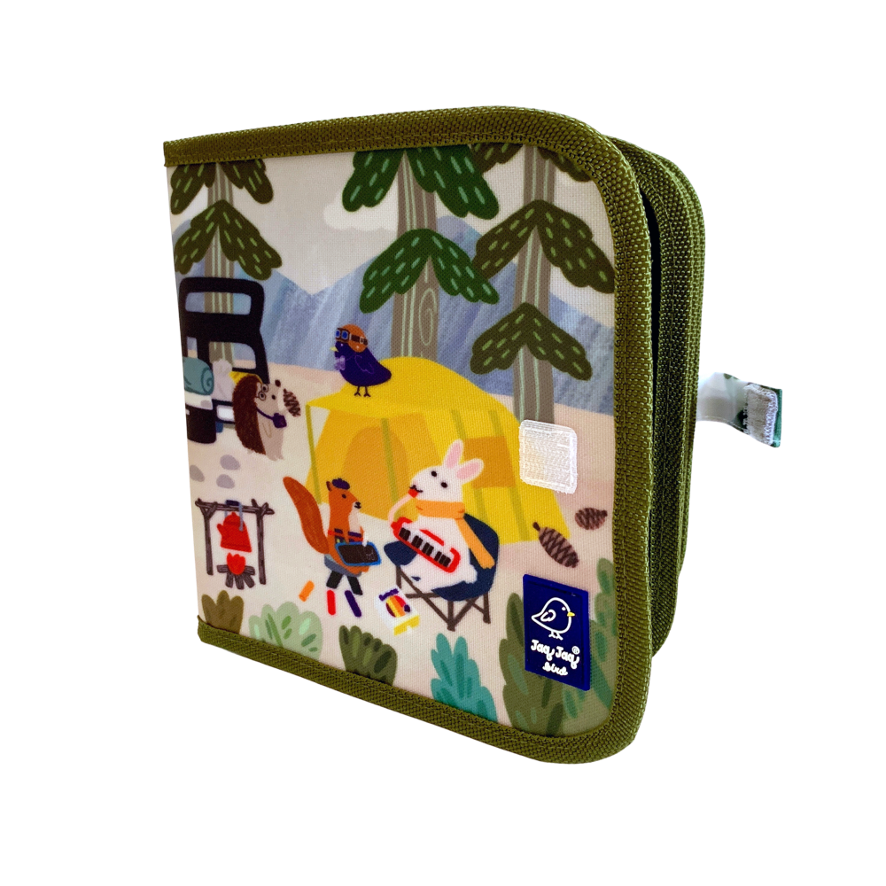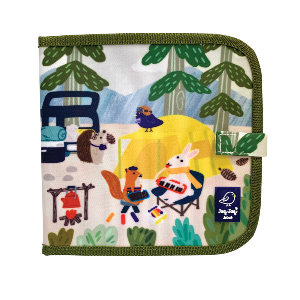Jaq Jaq Bird piešimo knyga su netepančiomis kreidelėmis, Stovyklauti
