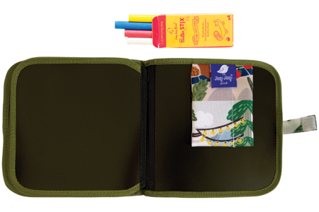 Knygelę sudaro 8 tušti puslapiai ir 4 nedulkančios ir netepančios rankyčių kreidelės.
