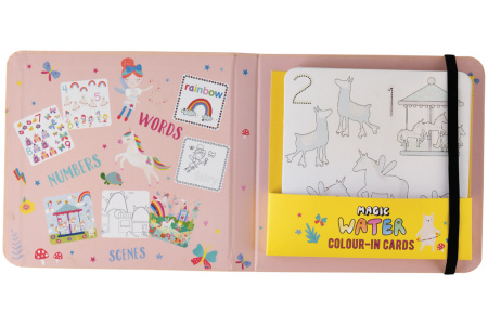 Pripildote markerį vandens ir piešiate ant kortelių, užpiešus vandeniu, atsiveria spalvos. Išdžiuvus, spalvos dingsta. Ir vėl viskas iš naujo. Pakuotė patogi nešiotis, keliauti. Korteles galima spalvinti daug kartų!