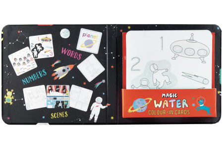 Pripildote markerį vandens ir piešiate ant kortelių, užpiešus vandeniu, atsiveria spalvos. Išdžiuvus, spalvos dingsta. Ir vėl viskas iš naujo. Pakuotė patogi nešiotis, keliauti. Korteles galima spalvinti daug kartų!