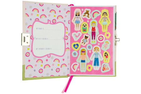 • Viduje rasite lipdukų su geriausiomis draugėmis lėlėmis bei jų aksesuarais ir spalvotas juosteles puslapiams atskirti.