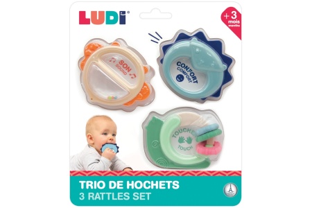 3 barškučių rinkinys – puikiai tinka lavinti ankstyvuosius smulkiosios motorikos įgūdžius.