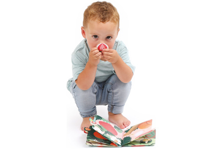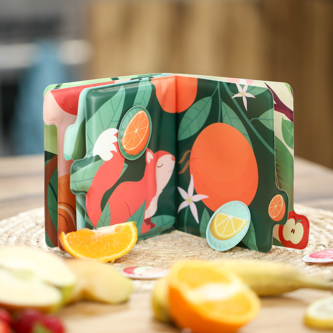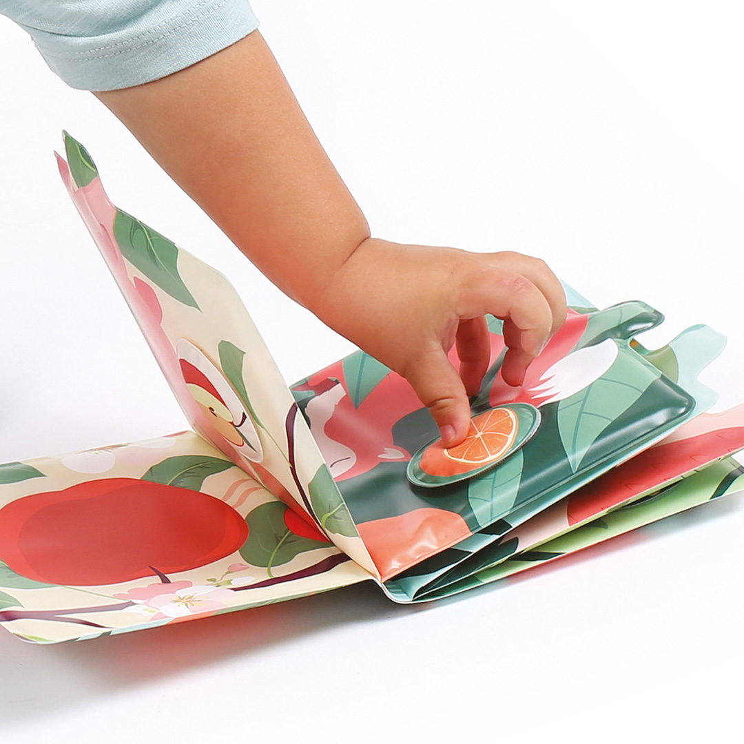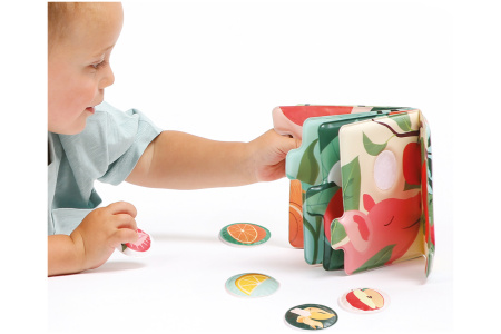 Vaikas vartydamas knygelę ieško to paties vaisiaus. Mokosi pažinti spalvas, gyvūnus, vaisius ir jų kvapus.