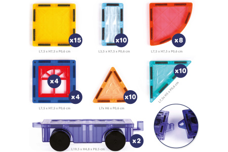 - 61 magnetas (15 kvadratai, 8 apskritimo ketvirčiai, 10 stačiakampių, 20 trikampių, 4 langai).