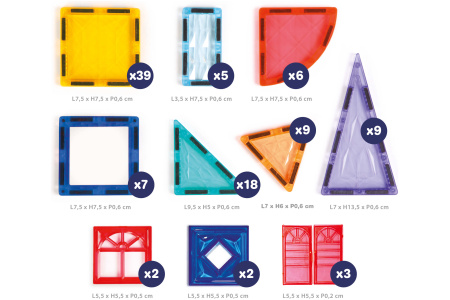 - 100 įvarių formų magnetų (kvadratai, apskritimo ketvirčiai, stačiakampiai, trikampiai, langai).