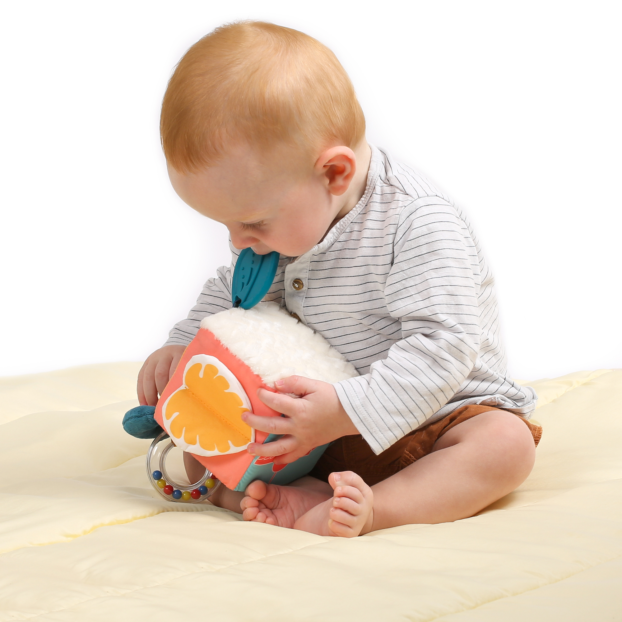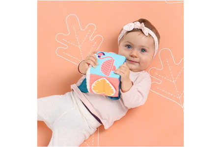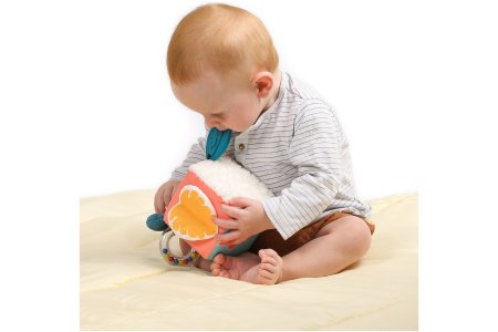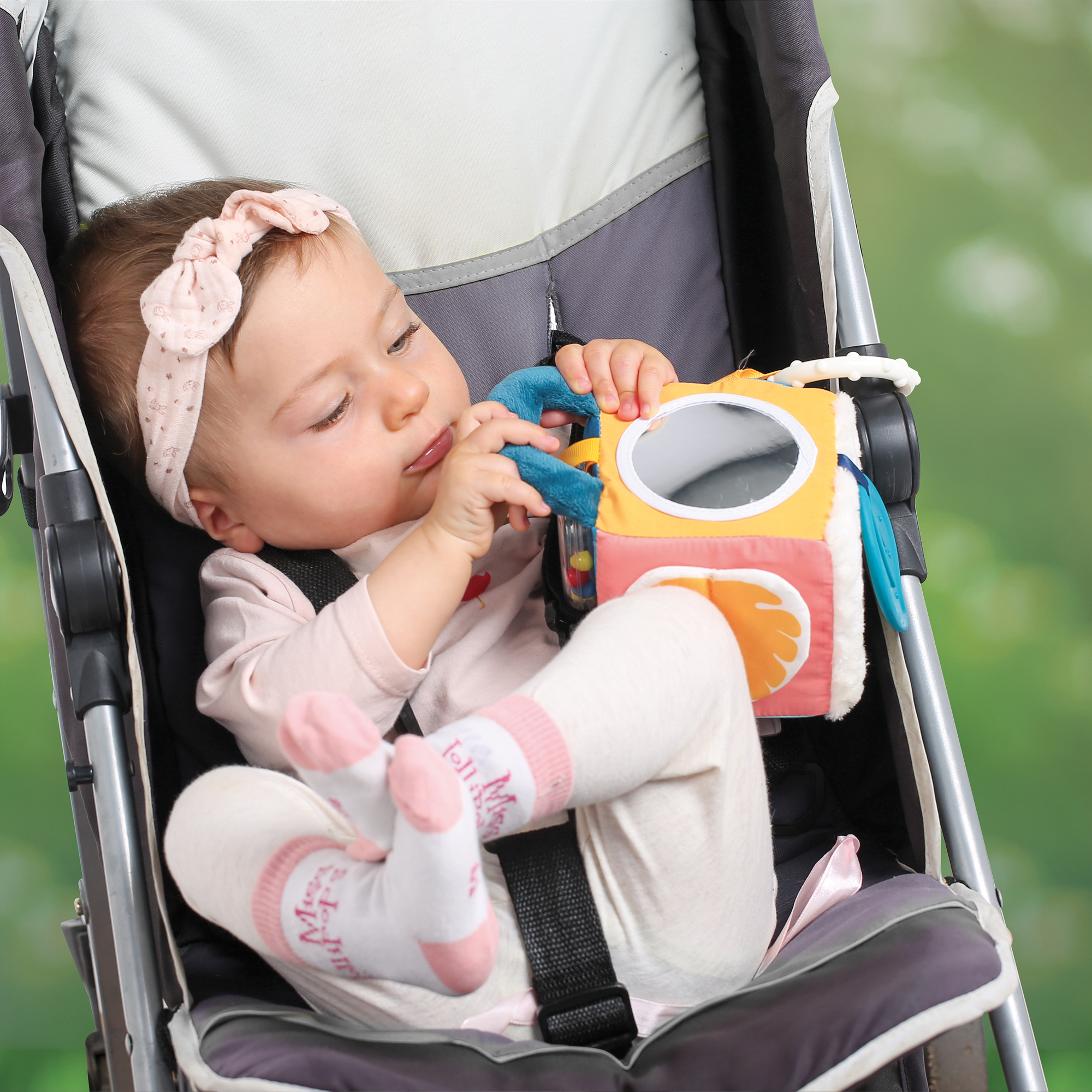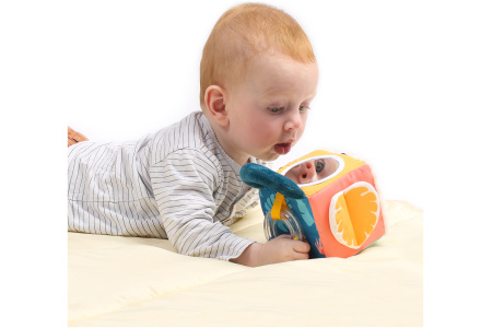Yra veidrodėlis, barškutis, kramtukas, patogi rankenėlė paimti į rankytę.