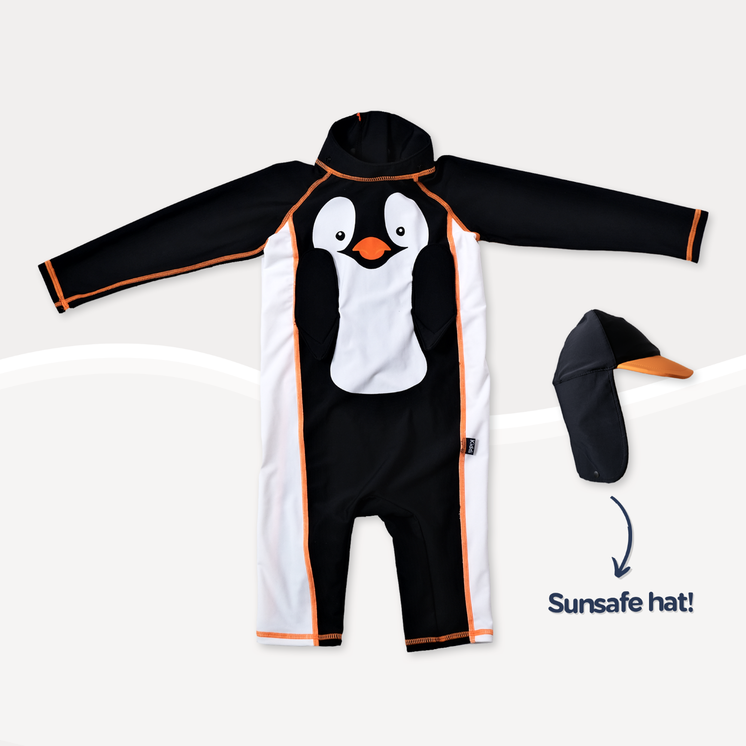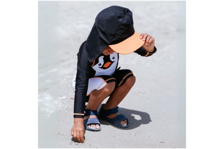Šis maudymosi kostiumėlis turi kepurę su prailgintu snapeliu, kuri padeda pasislėpti nuo saulės spindulių, todėl žaisti lauke tampa maloniau. Kepurė saugiai prisitvirtina prie kostiumo spaudėmis.