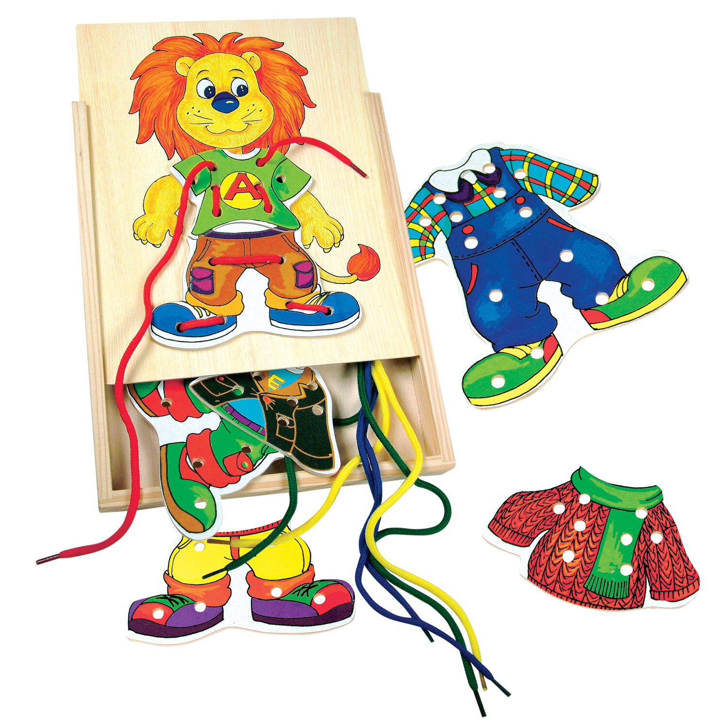 - vaikas gali prisiūti drabužėlius prie liūto, naudodamas 4 skirtingų spalvų raištelius,