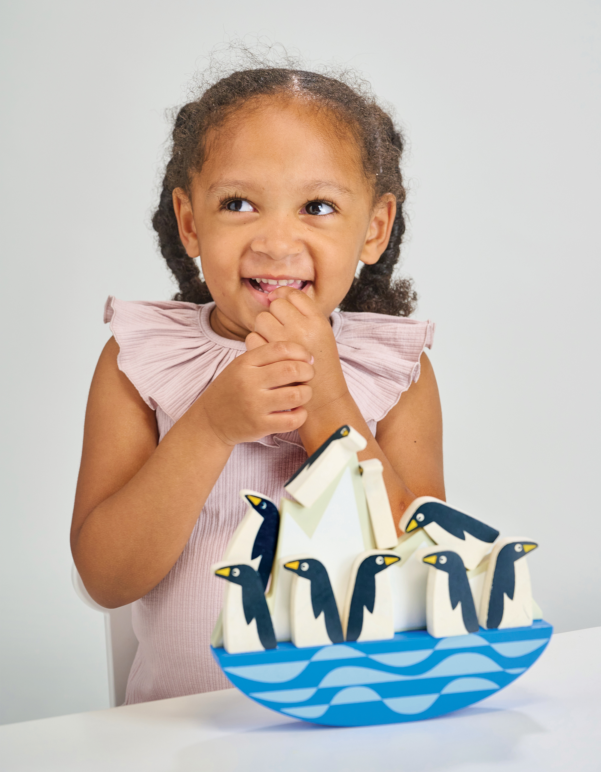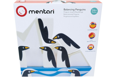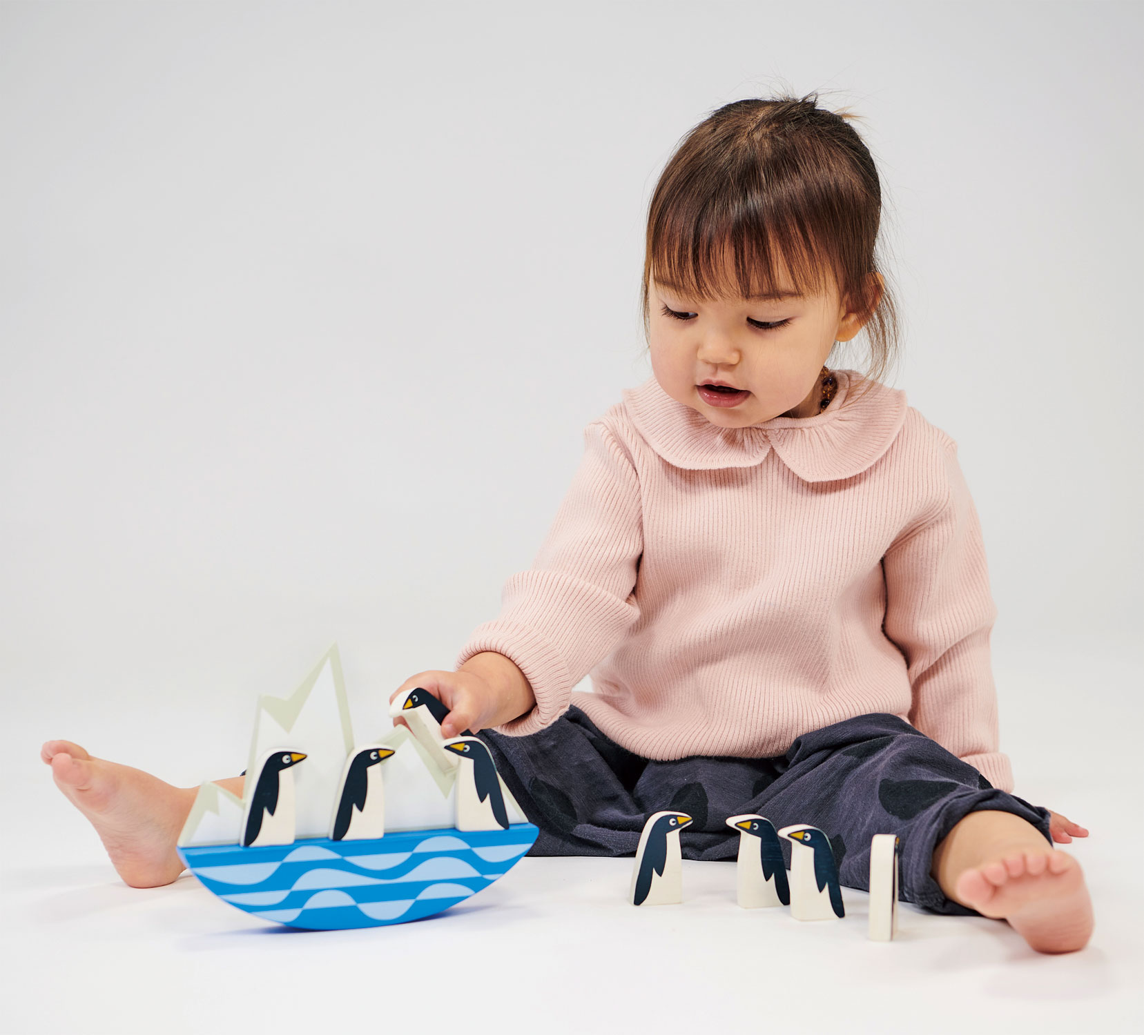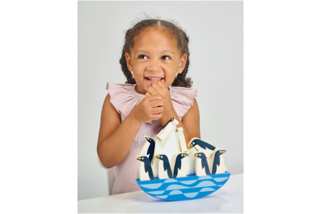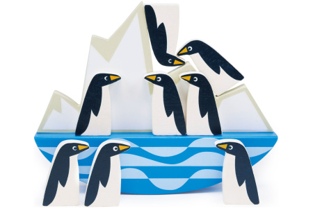 8 pingvinai balansuojantys ant siūbuojančio ledkalnio.