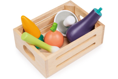 Šioje žaislinėje medinėje dėžutėje rasite baklažaną, morką, grybą, ropę ir porą.