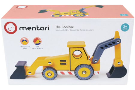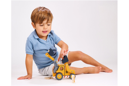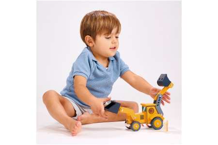 Šis medinis ekskavatorius turi 2 judinamus kaušus – vieną priekyje ir vieną gale.
