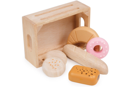 Šioje žaislinėje medinėje dėžutėje rasite kruasaną, batoną, spurgą, bandelę su šokoladu ir dvi mėsainio bandeles.