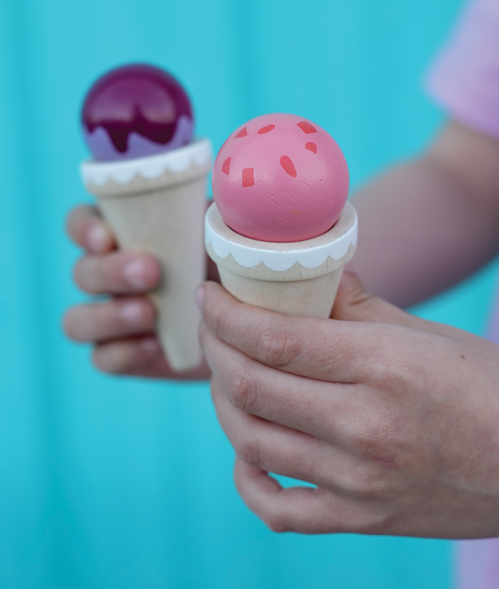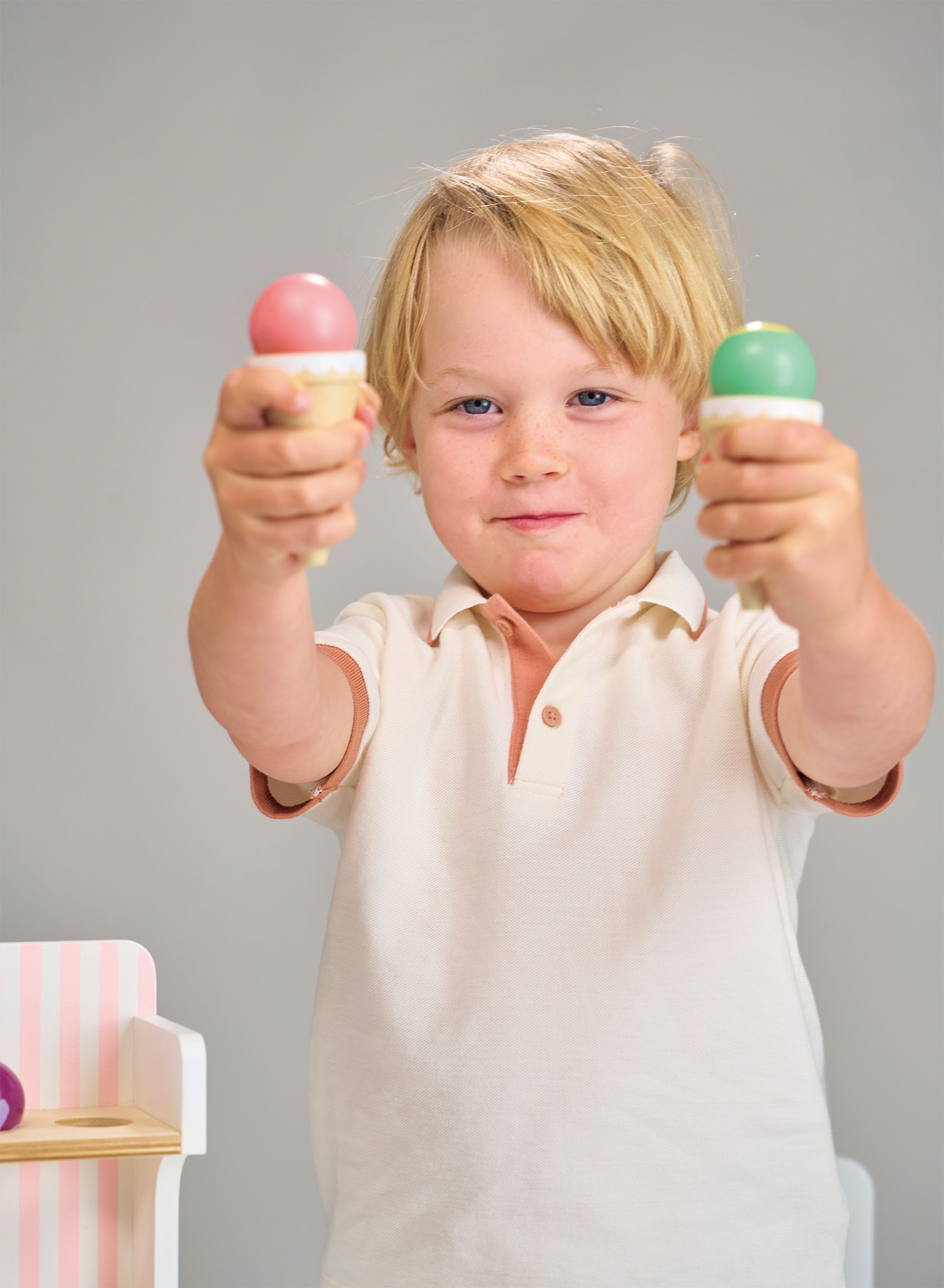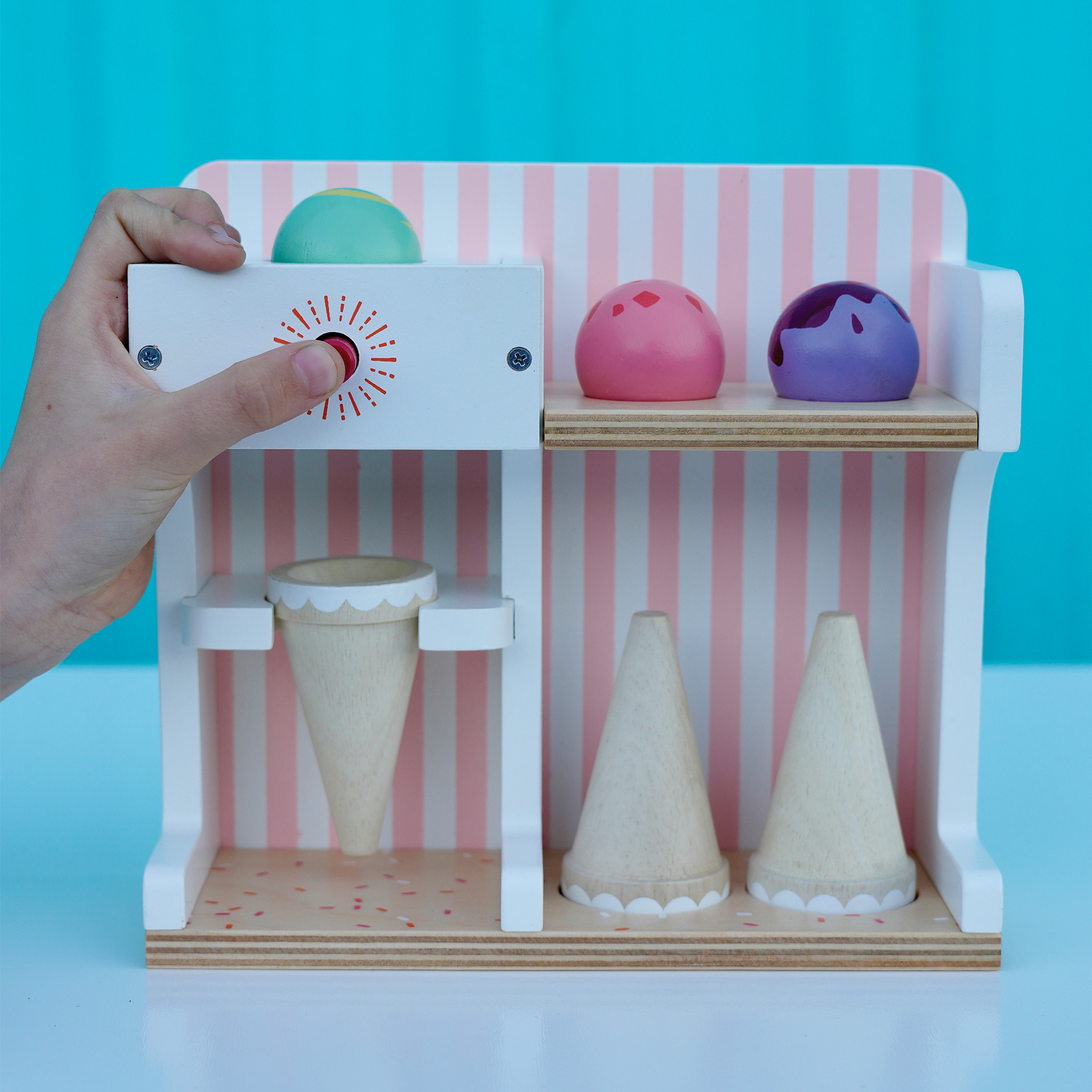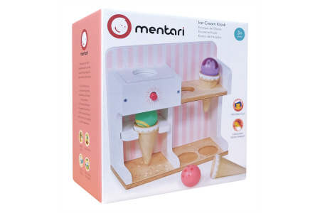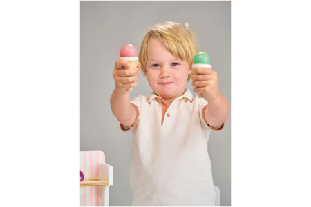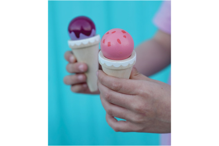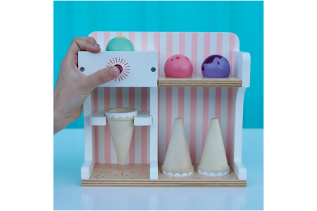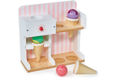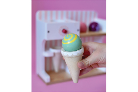 Ledų parduotuvėlėje rasite 3 ledų rutuliukus, 3 vafliukus ir ledų gaminimo aparatą.