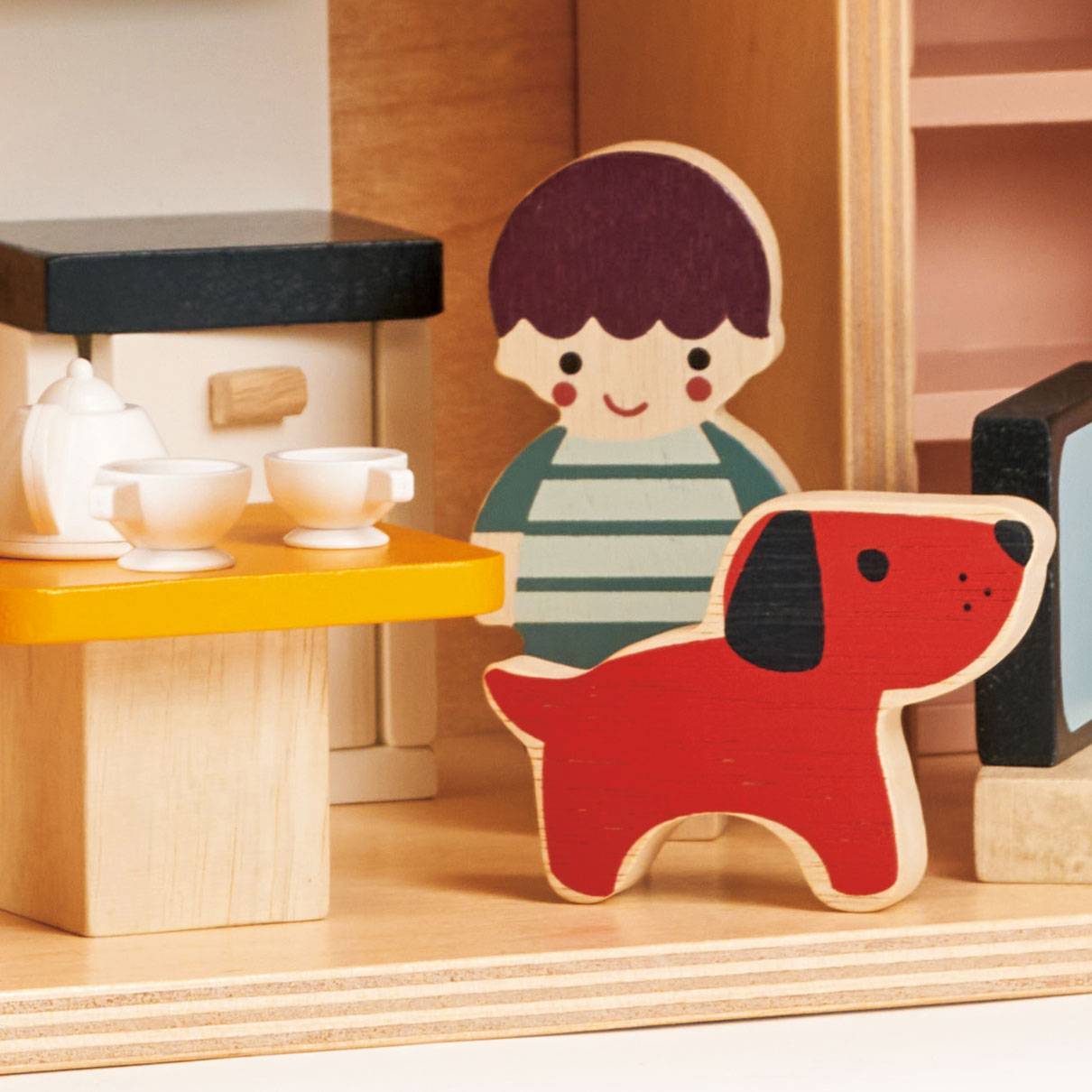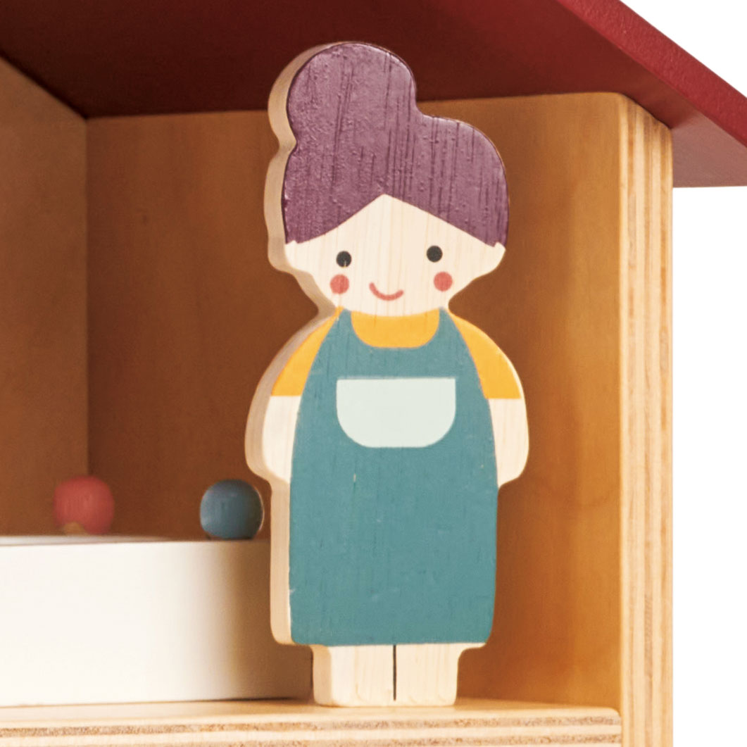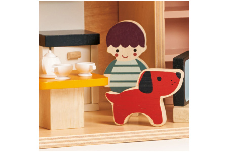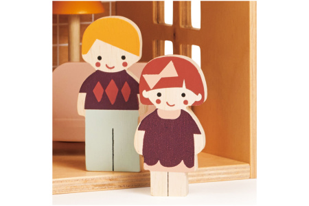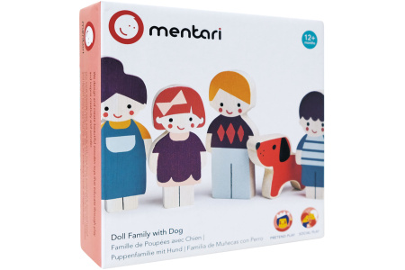 5 medinių figūrėlių – lėlyčių rinkinys: mama, tėtis, du vaikai ir šuniukas.