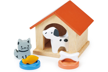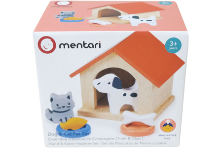 Rinkinyje namelis, kačiukas, šuniukas ir jų dubenėliai su maistu.