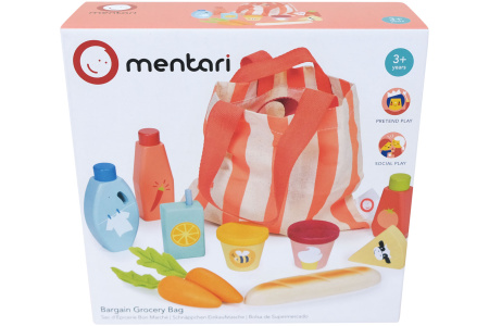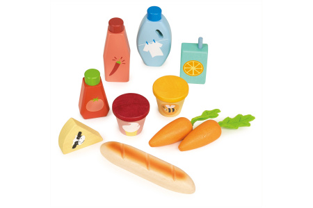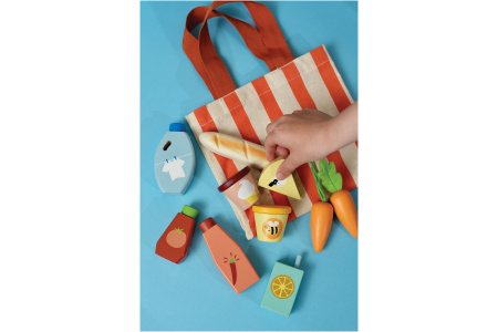 Šiame dailiame pirkinių maišelyje rasite pomidorų padažą, čili padažo buteliuką, skalbimo skysčio pakuotę, dėžutę ledų, medaus puodynę, sulčių pakelį, sūrio gabalėlį, batoną ir 2 morkas.
