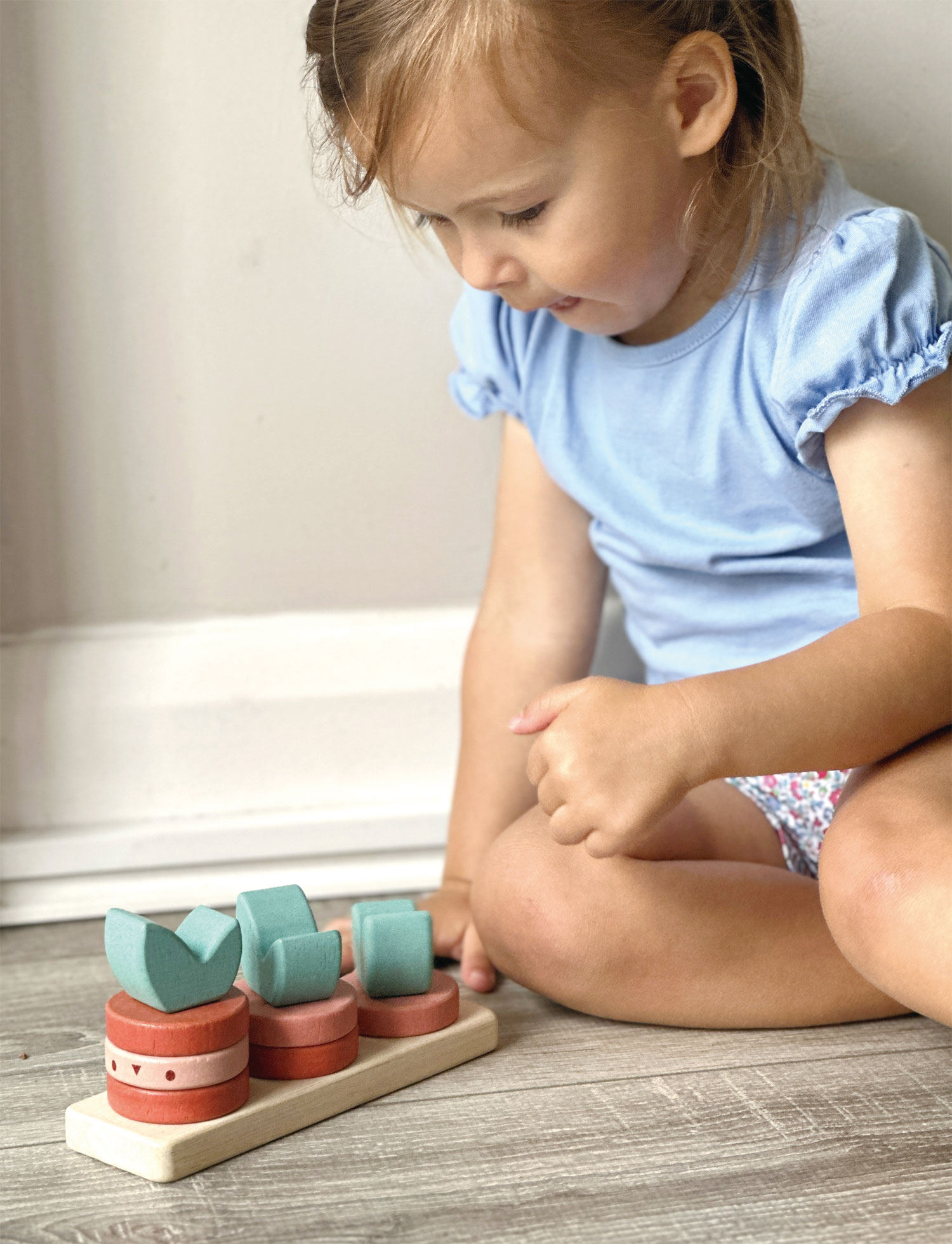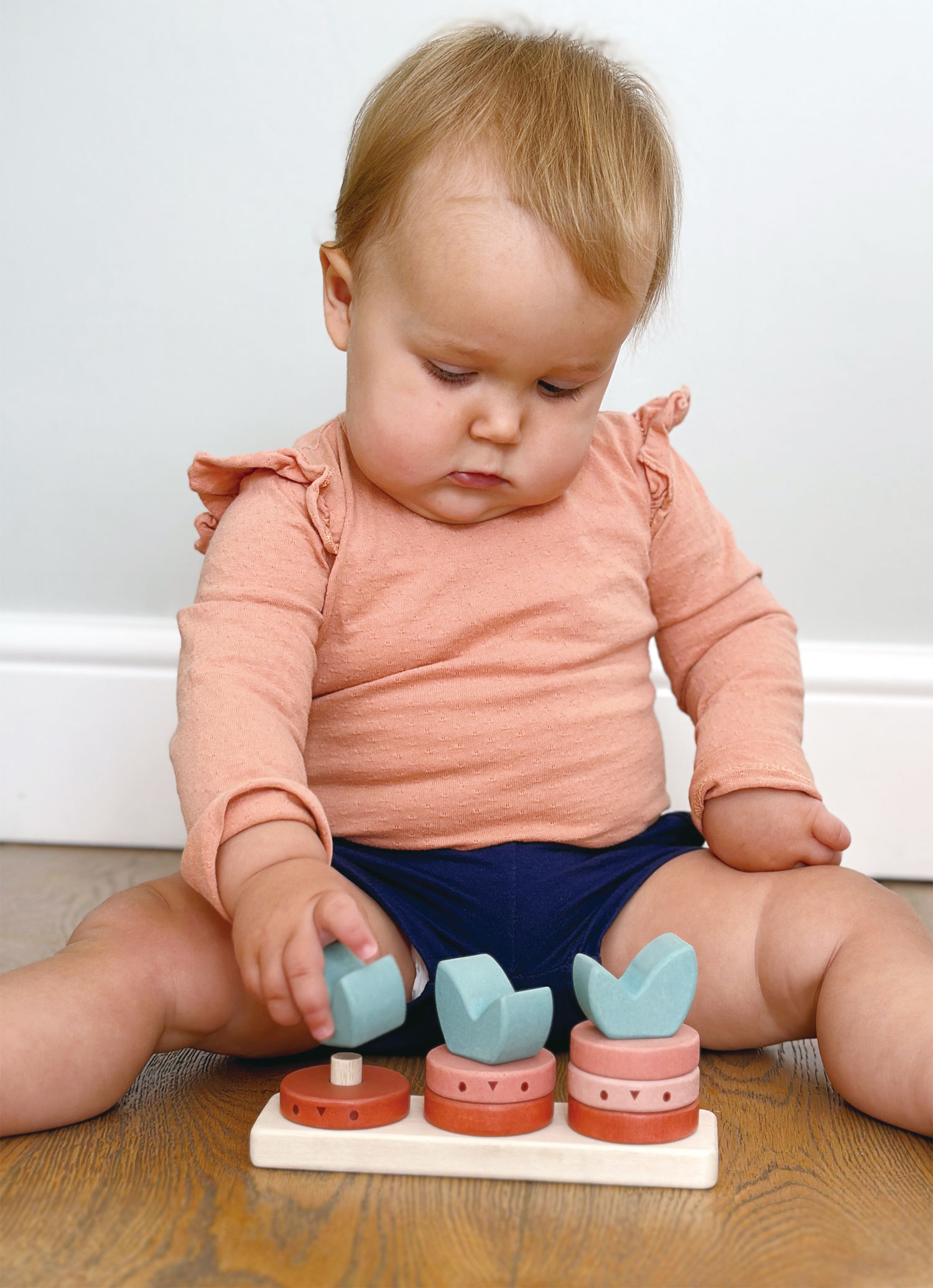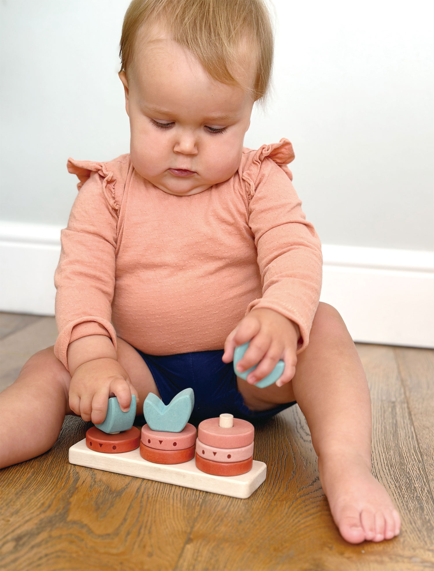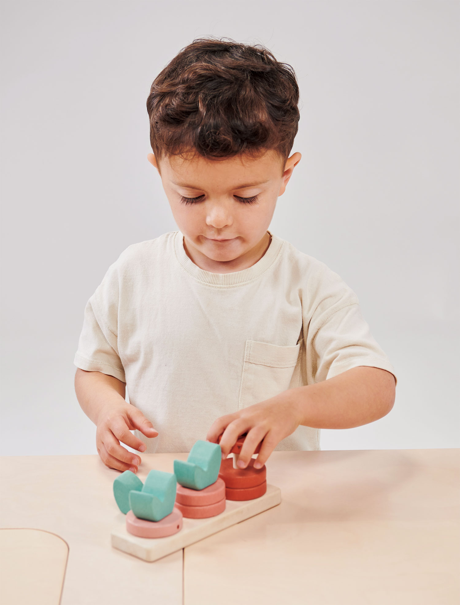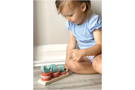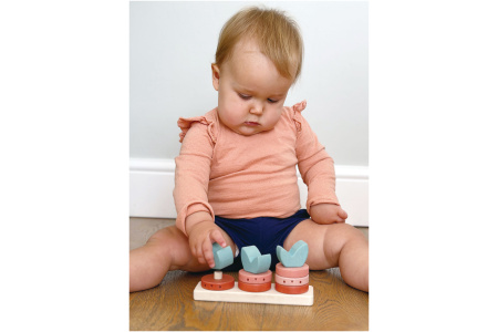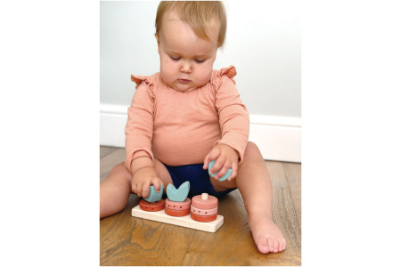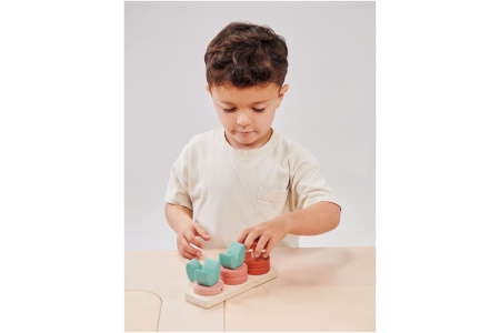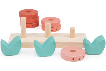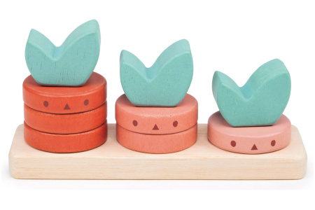 Rūšiavimo žaislas iš 10 detalių: pagrindukas, 6 skaičiavimo žiedai bei 3 viršūnėlės – lapai.