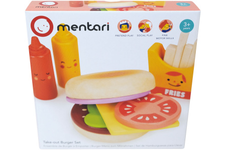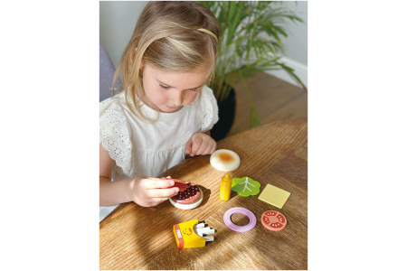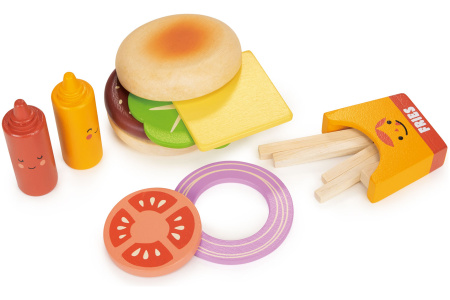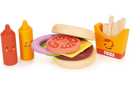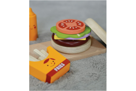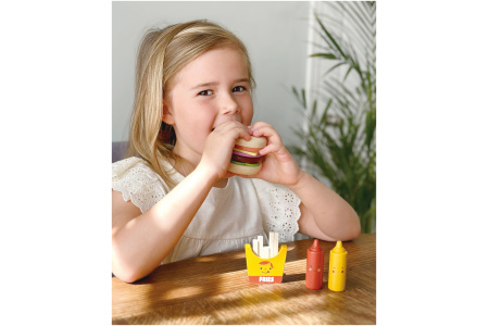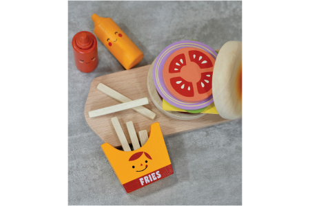 Rinkinyje žaislinis sumuštinis pagamintas iš 5 skirtingų dalių, 2 padažų buteliukai ir 5 bulvytės fri specialioje dėžutėje.