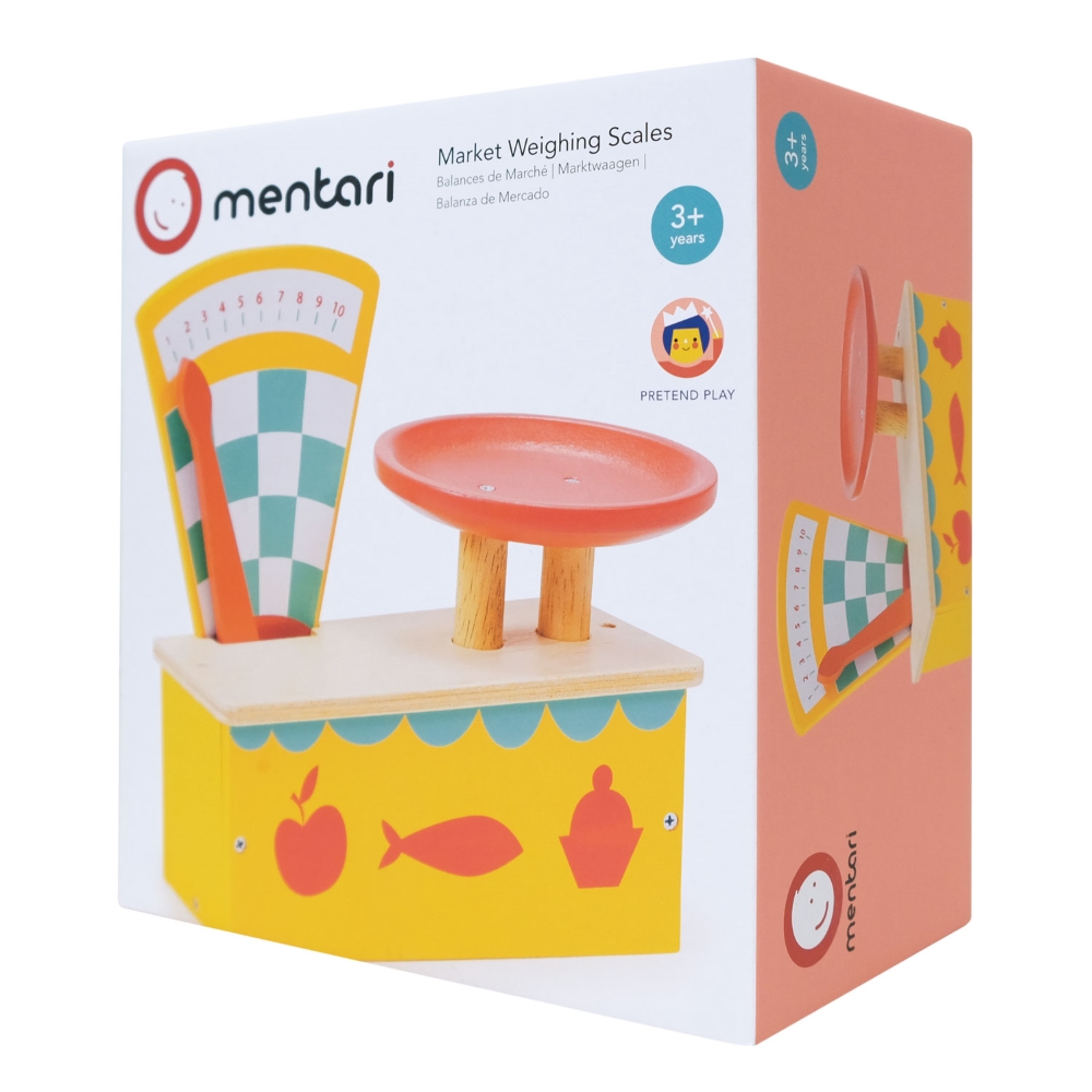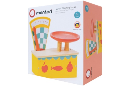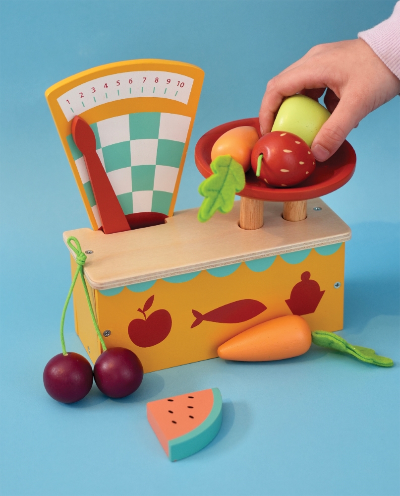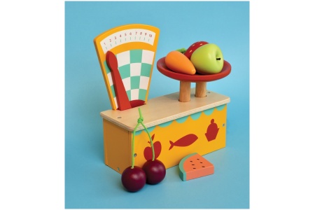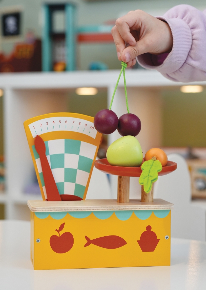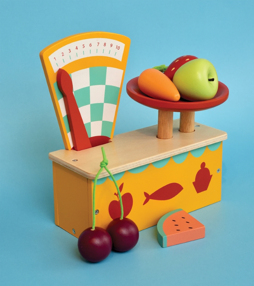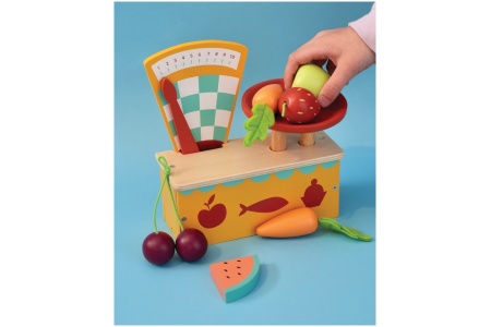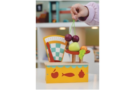 Medinės vintažinės svarstyklės su lėkštele, ant kurios padėjus maisto produktus, svarstyklių rodmuo juda.