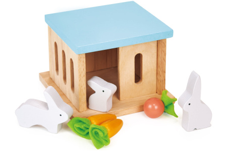 Žaislinis triušiukų namelis su 3 triušiukais, 2 morkytėmis ir 1 rope.