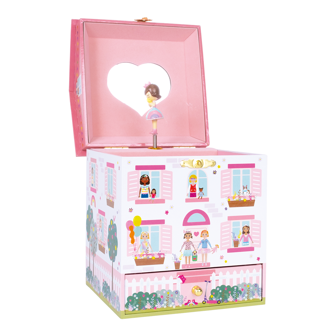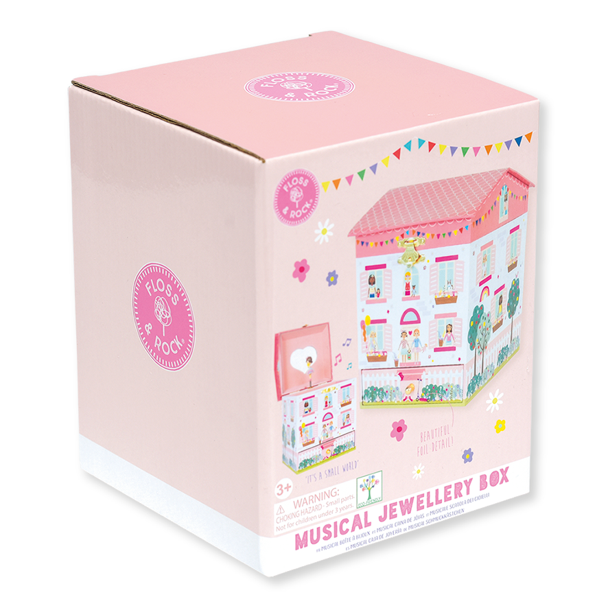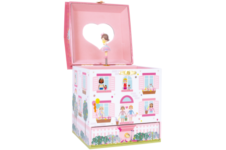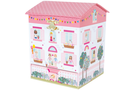 Išskirtinio grožio muzikinė papuošalų dėžutė, dekoruota kaip lėlių namelis. Turi pagrindinį skyrių ir stalčiuką smulkmenėlėms susidėti. Yra širdelės formos veidrodėlis ir prieš jį besisukanti lėlytė.