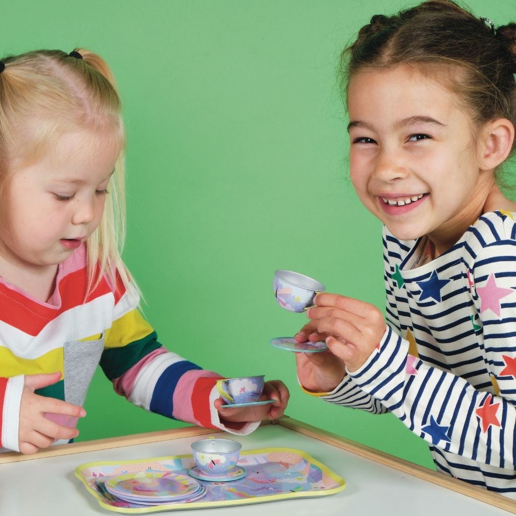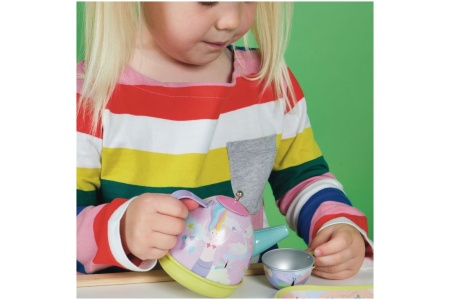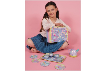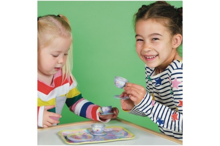 Atvėrę lagaminėlį, rasite: virdulį skleidžiantį melodiją, vieną padėklą, keturis arbatos puodelius su lėkštutėmis ir keturias didesnes lėkštutes.