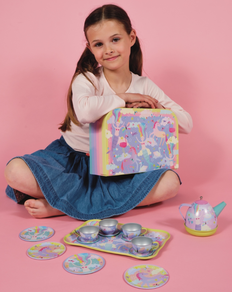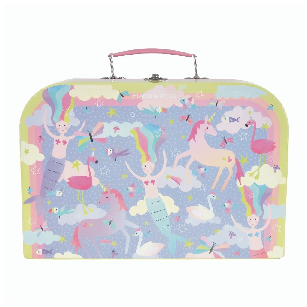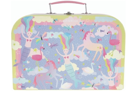 Dėžutė ir indukai apipavidalinti vienaragiais, undinėlėmis, flamingais, debesėliais ir žvaigždutėmis.