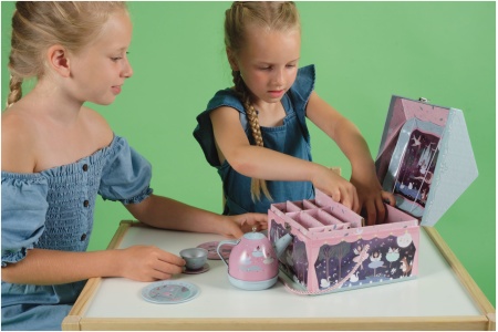 Atvėrę teatro scenos formos dėžutę, rasite: virdulį skleidžiantį garsą, vieną padėklą, du šaukštelius, du arbatos puodelius su lėkštutėmis ir dvi didesnes lėkštutes.