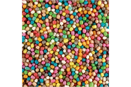 - Pagamintas iš kukurūzų ir nudažytas maistiniais dažikliais