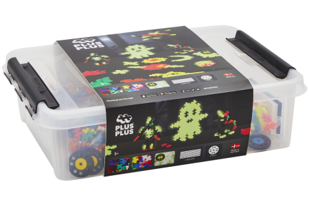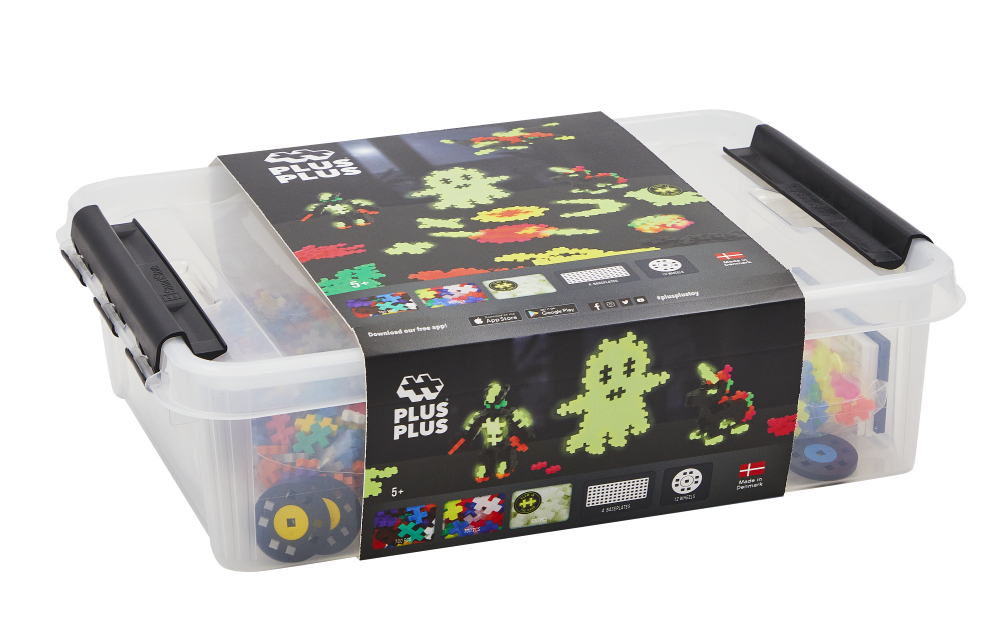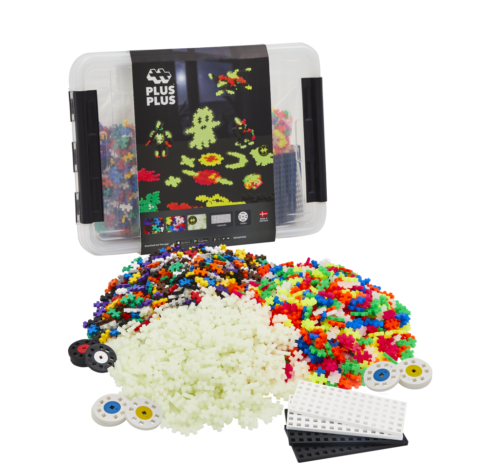 - 2000 detalių: 700 pagrindinių spalvų, 700 neoninių, 600 šviečiančių tamsoje Plus Plus spalvų