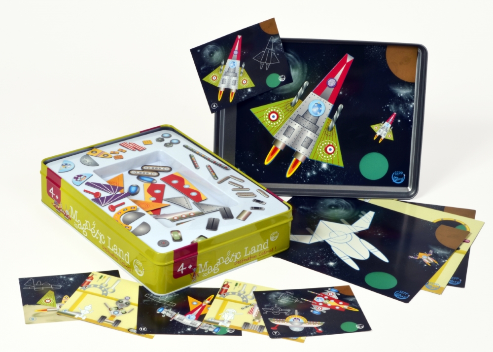 - 6 iš abiejų pusių spalvotos kortelės (iš viso 12 skirtingų kosminių laivų dydis 105×85 mm.