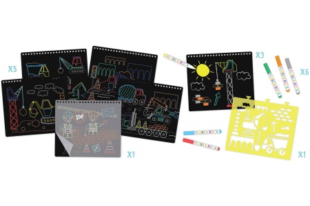 - 8 nuvalomi lapai, kurie gali būti naudojami daug kartų! 5 puslapiai skirti spalvinimui, 3 lapai – piešimui.