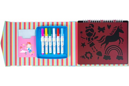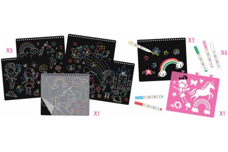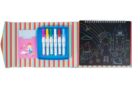 • 8 nuvalomi lapai, kurie gali būti naudojami daug kartų! 5 puslapiai skirti spalvinimui, 3 lapai – piešimui.