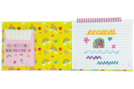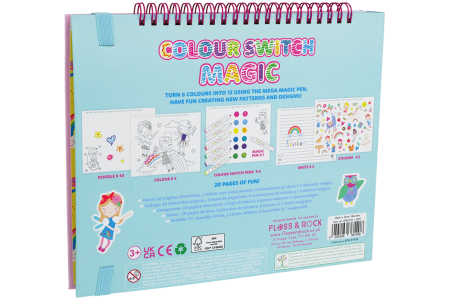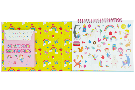 Lavinkite rašymo įgūdžius, spalvinkite ir pieškite taip, kaip tik norite, keiskite spalvas su magišku baltu markeriu ir nepamirškite papuošti knygelės puslapius pridėtais lipdukais!