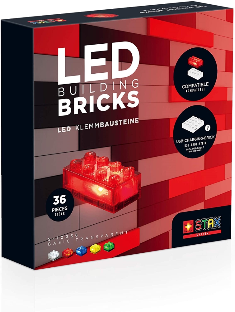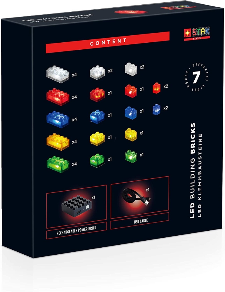 - 36 šviečiančios STAX System kaladėlės (raudonos, geltonos, mėlynos, žalios, baltos spalvų).